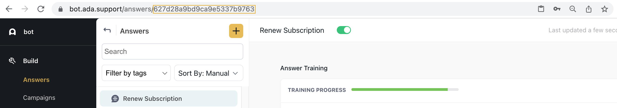 Use this setting to customize the greeting messages that new chatters see. This is useful for setting view-specific greetings across your app. The greeting should correspond to the ID of the Answer you would like to use, which you can find in the URL of the corresponding Answer in the dashboard.