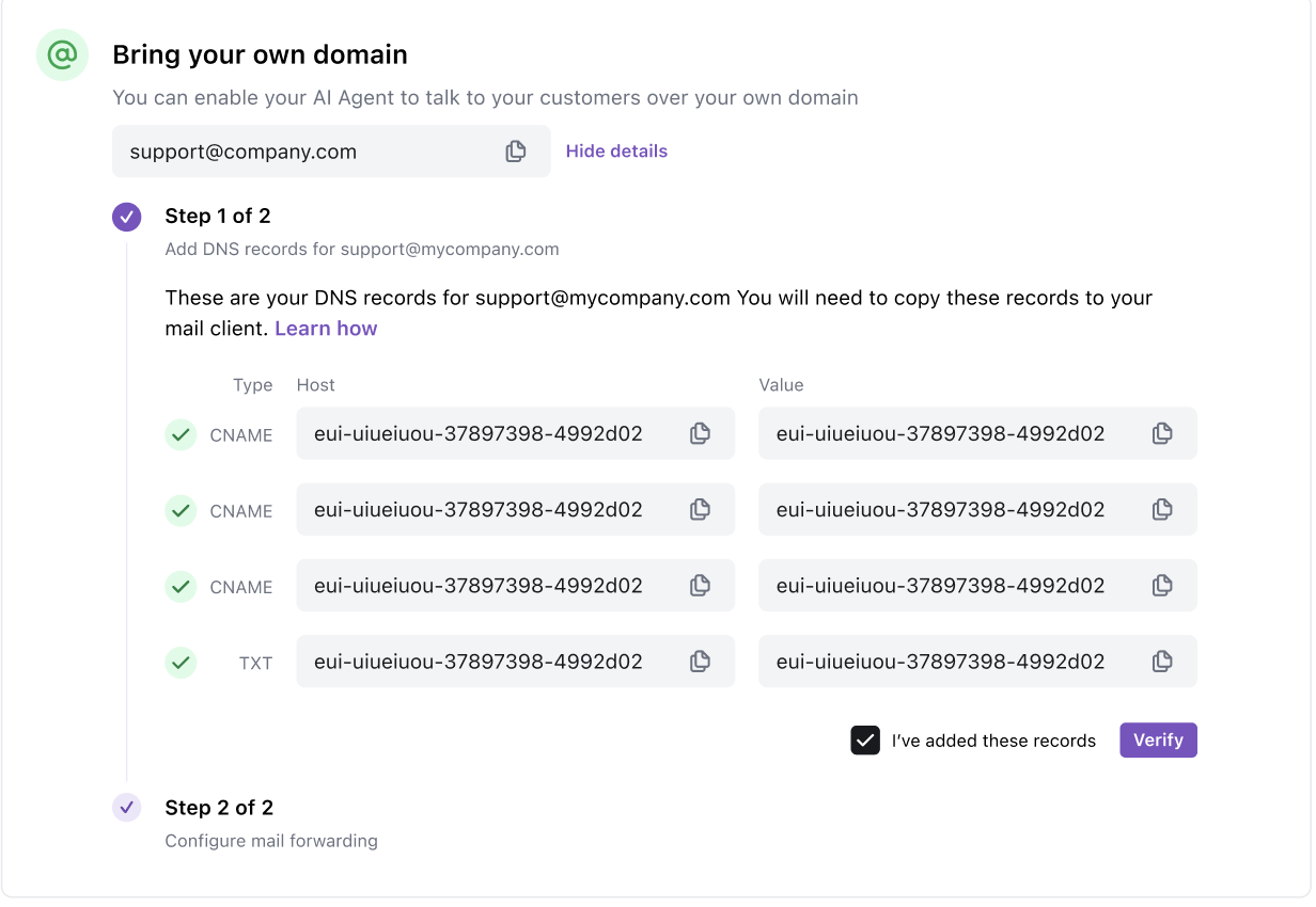 Coordinate with your IT team to get those records added to your domain. After they’ve been added, select the I’ve added these records check box, then click Verify. As soon as Ada receives verification status confirmation, your AI Agent displays the verified status on the dashboard, and you can proceed to set up email forwarding.