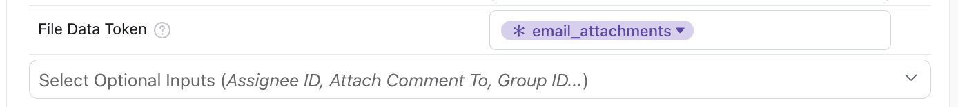 - Add the File Data Token field from the Optional Inputs, and in that field, add the email_attachments variable to ensure that your AI Agent can pass any attachments to Zendesk.