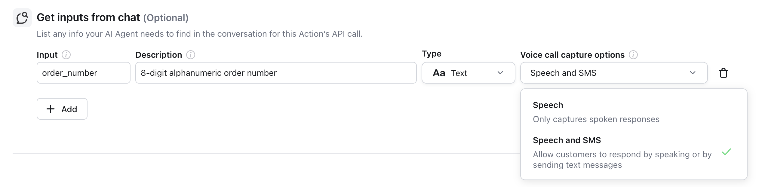 - Number — Speech: Your AI Agent will capture the input from the end user’s spoken response. — Speech and SMS: Your AI Agent will give the end user the option to provide the input by speaking it or by responding to a text message from the AI Agent with the input. — Speech and DTMF: Your AI Agent will give the end user the option to provide the input by speaking it or by using their phone’s dial pad.