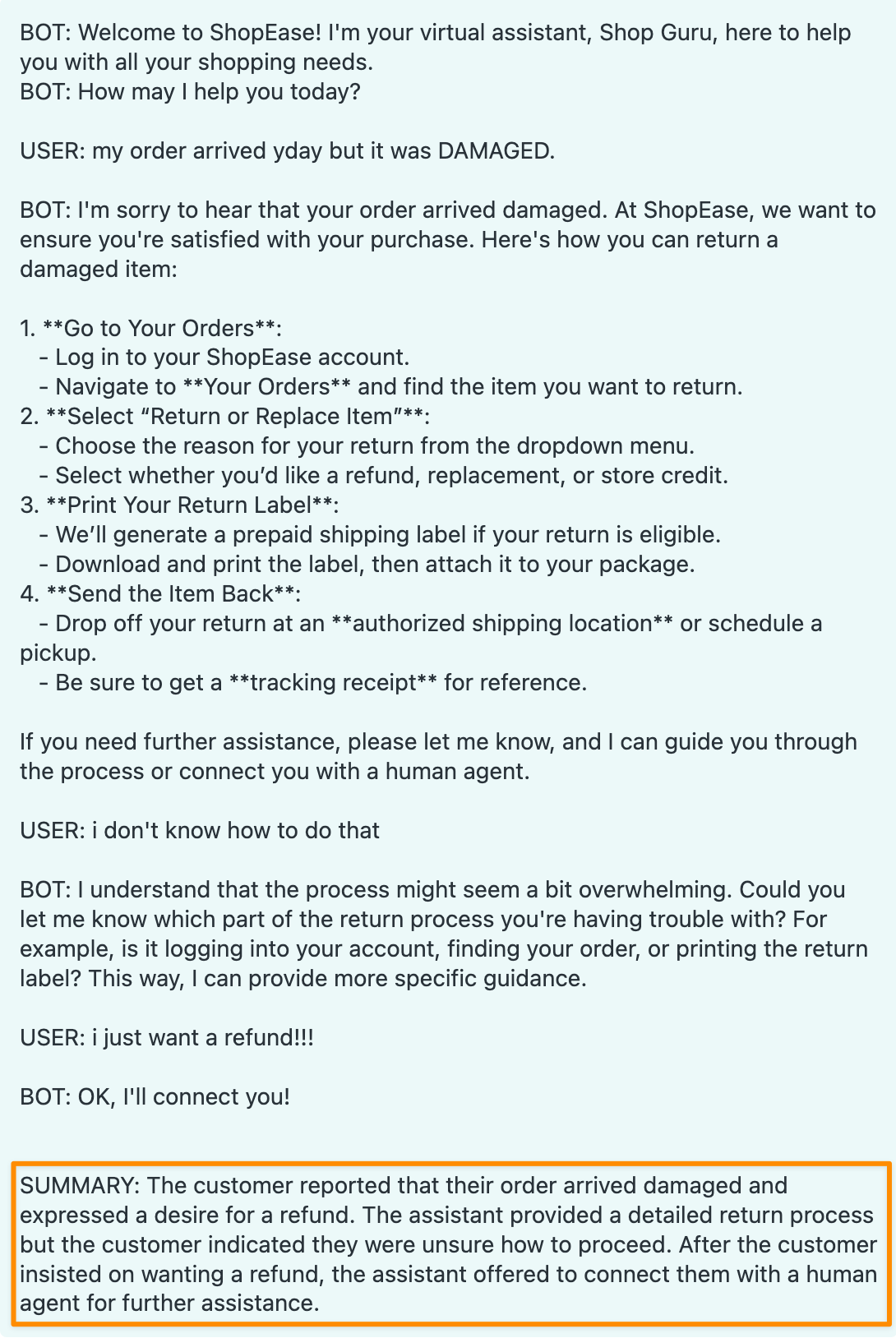 Ada can automatically attach a summary of a customer’s conversation to a handoff transcript. This summary helps support agents quickly determine the reason for the escalation.