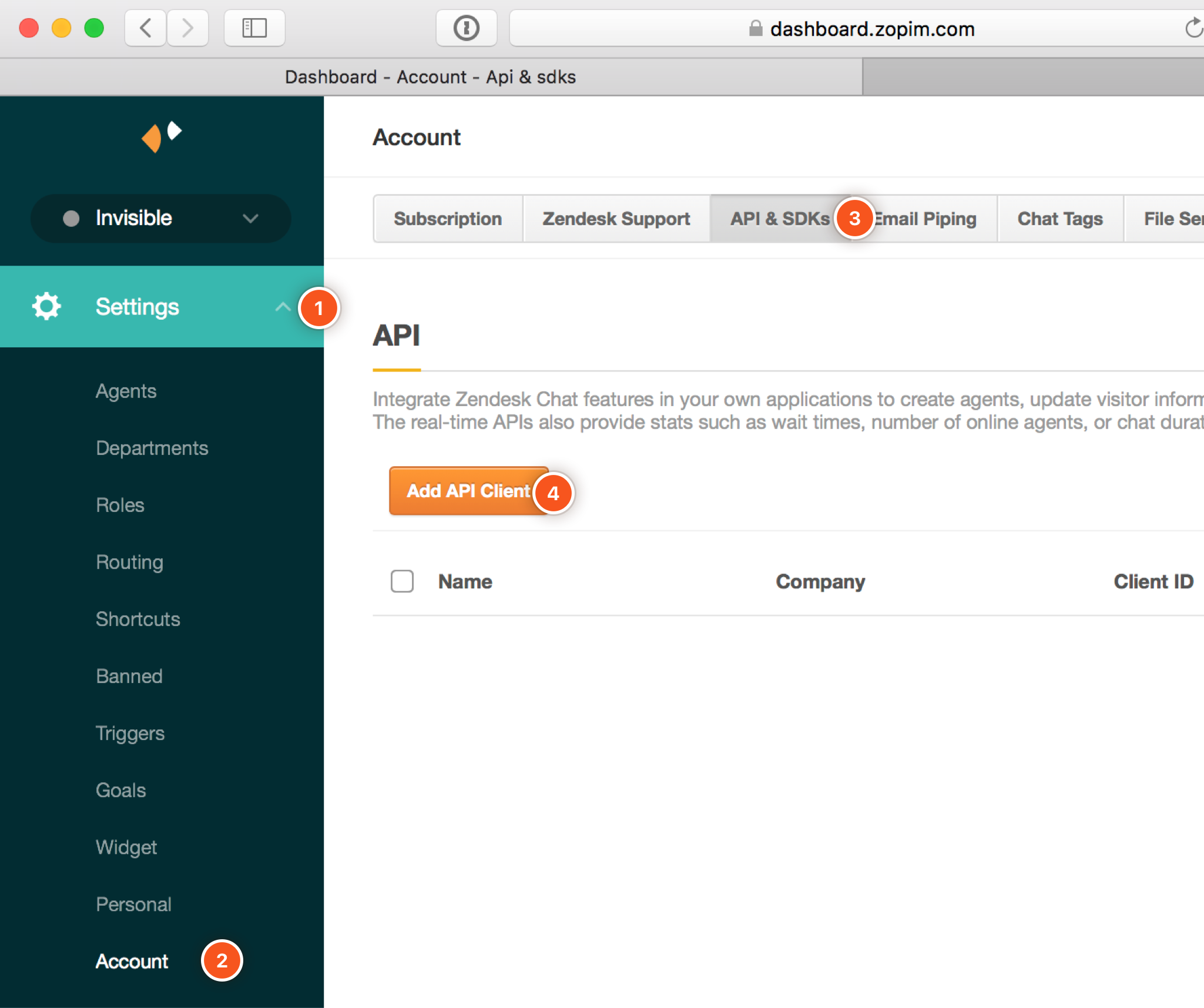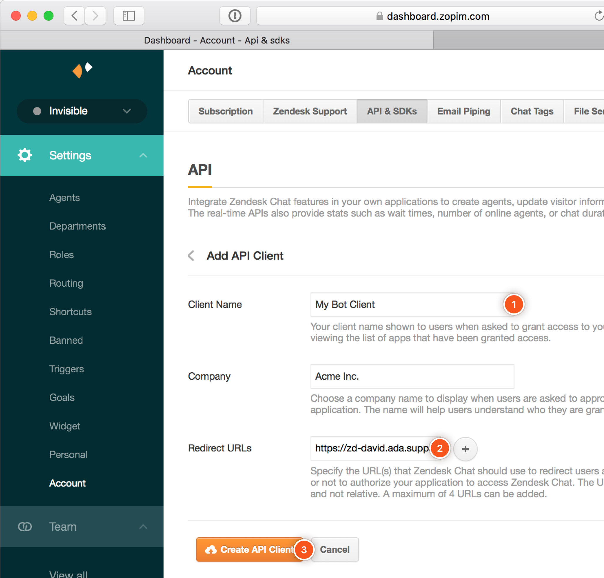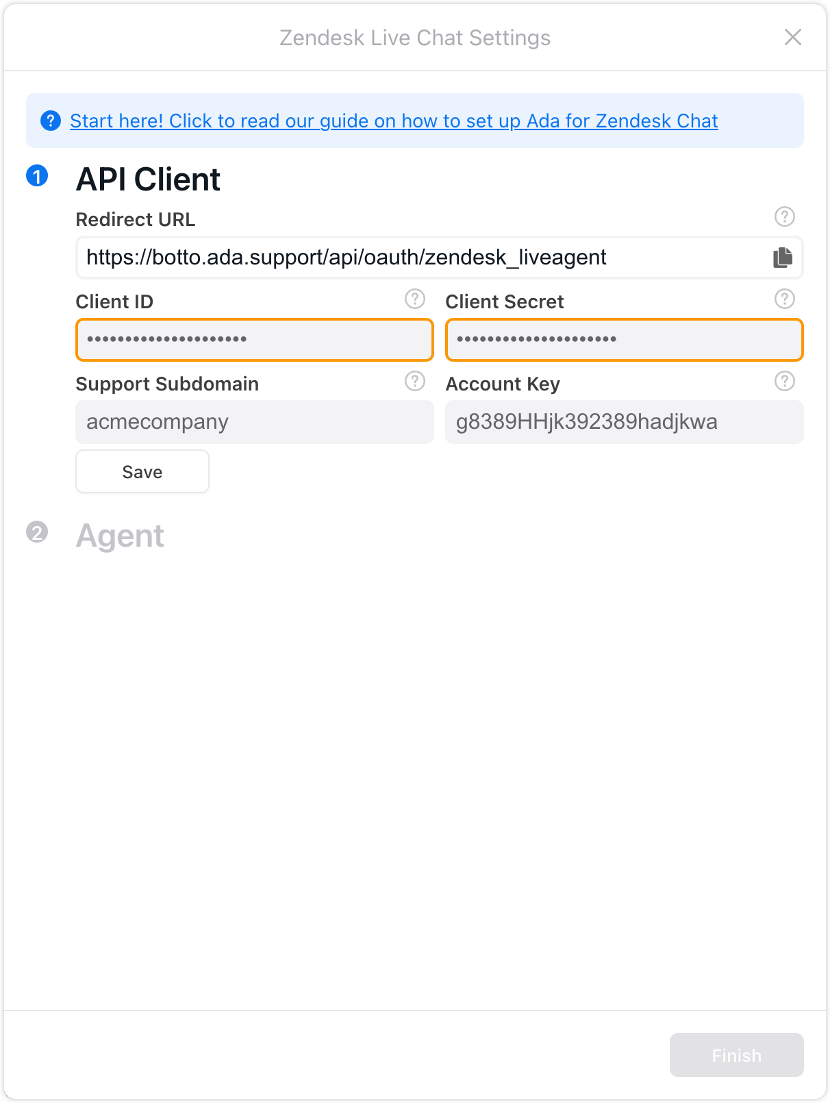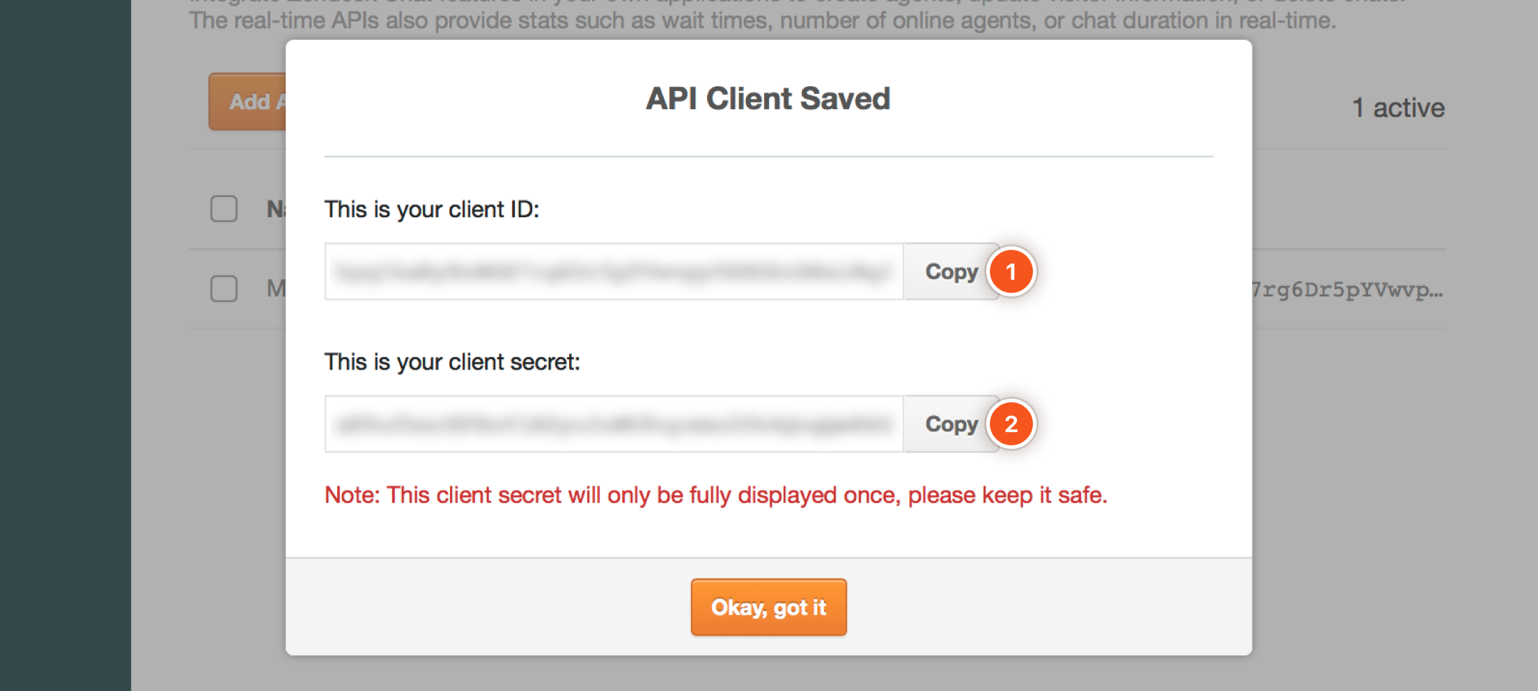You will need to copy the following details from Zendesk Chat and paste them into the matching Zendesk Chat Settings fields in Ada. Please note, this prompt will only show once, so be sure to follow the steps below. If you accidentally close the API Client Saved window before copying the required fields, you will have to regenerate the Client Secret.