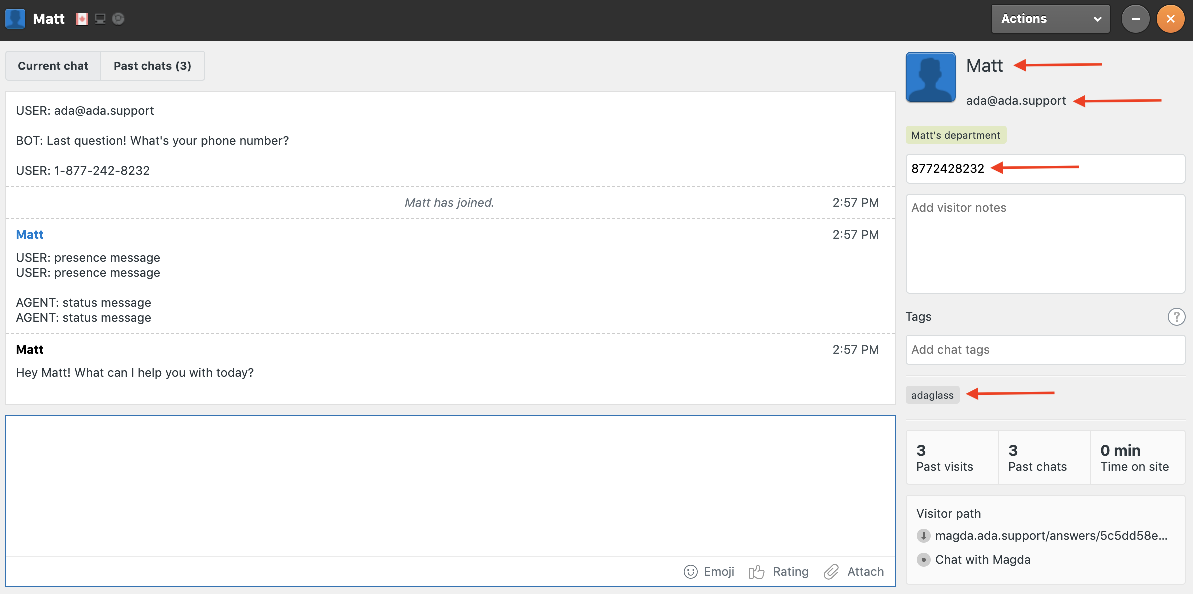 For clients on Zendesk Agent Workspace — Tags are supported, as well as the automatic mapping of name, email, and phone variables to ticket fields as long as they are lower case global variables in Ada.