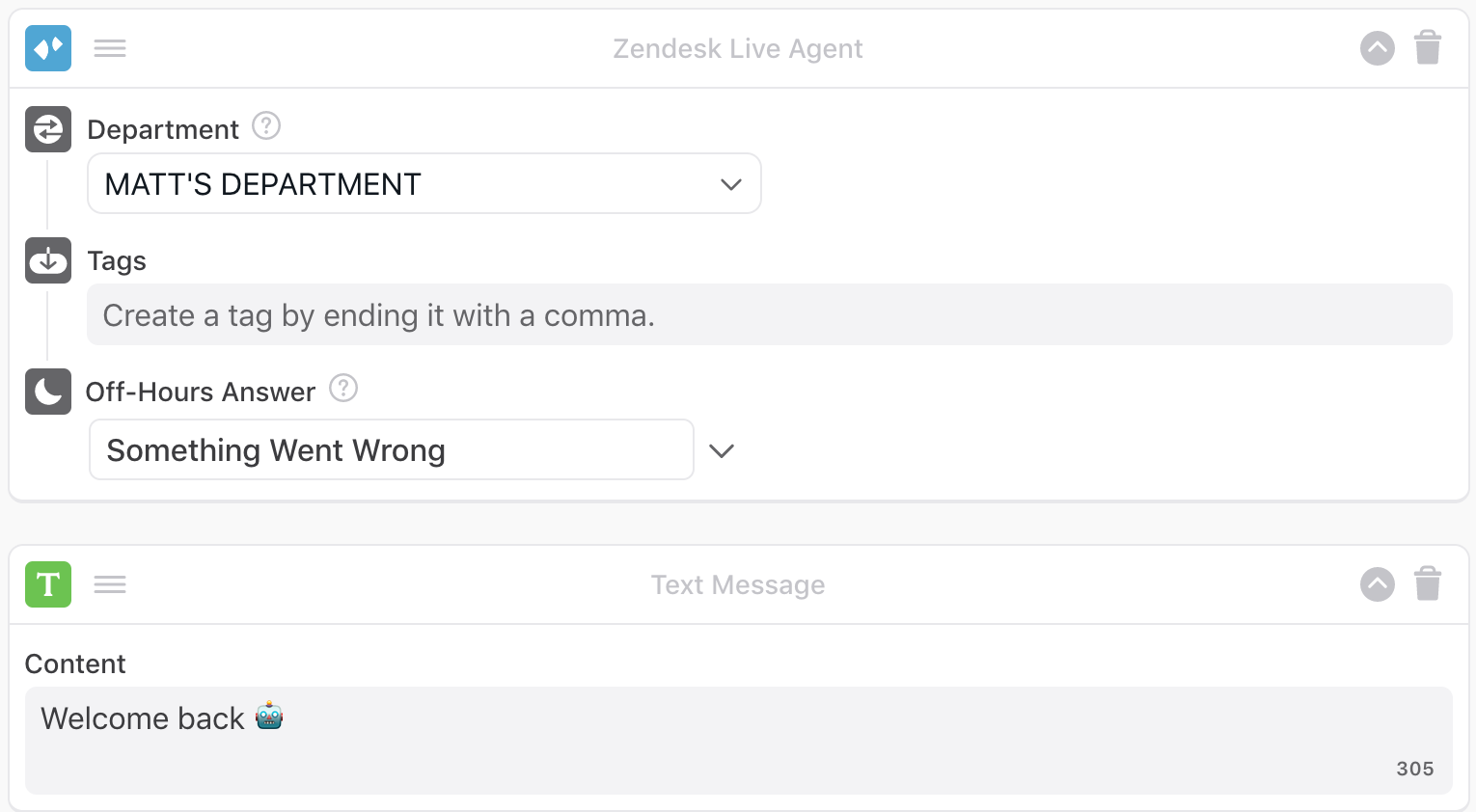 The Zendesk department or group that you identify in the Zendesk Live Agent Block will be the department customers are routed to for handoff. If there are no agents available in the preferred department, either due to your queues being full, or all agents being offline, the customer will be routed to the the Off-Hours dialog.