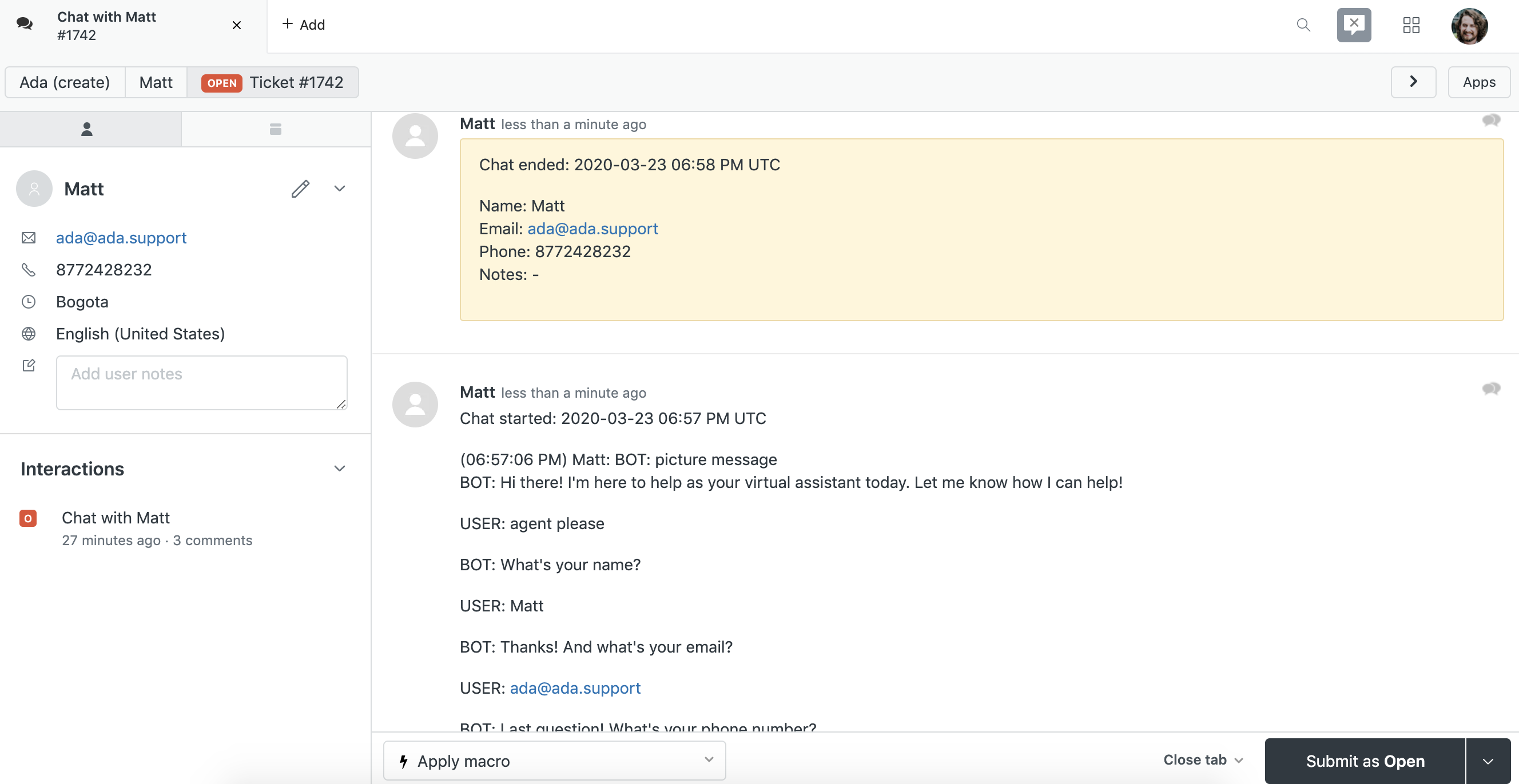 This article has been designed to outline the experience on the Zendesk side of things once you have configured Ada with your Zendesk environment. For detailed instructions on configuration, please see Configure Zendesk Chat.