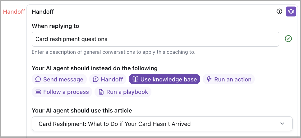 Let’s say the AI Agent confirm to the end user that a card was sent and check the address—but always initiates a Handoff when a reshipment might be possible. You can build on this behavior by helping the Agent use Knowledge to guide the end user instead of handing off prematurely: