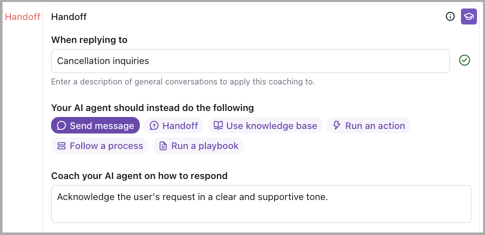 The AI Agent detects a cancellation intent but responds with a generic message like Let me connect you with support. This can lead to confusion and frustration, especially in a moment where clarity and empathy are critical. With Coaching, you can guide the Agent to acknowledge the request clearly and set expectations before handing off: