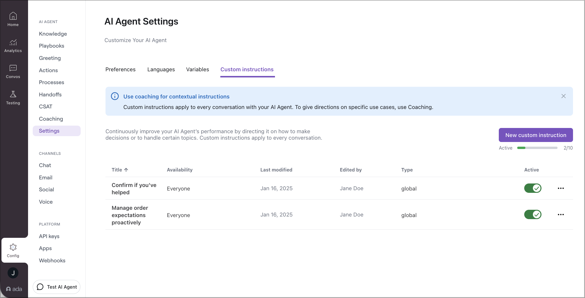 Go to the Custom Instructions tab under Config > AI AGENT > Settings. You’ll notice some of your saved Custom Instructions have been labeled as highly contextual and may be better suited as Coaching.