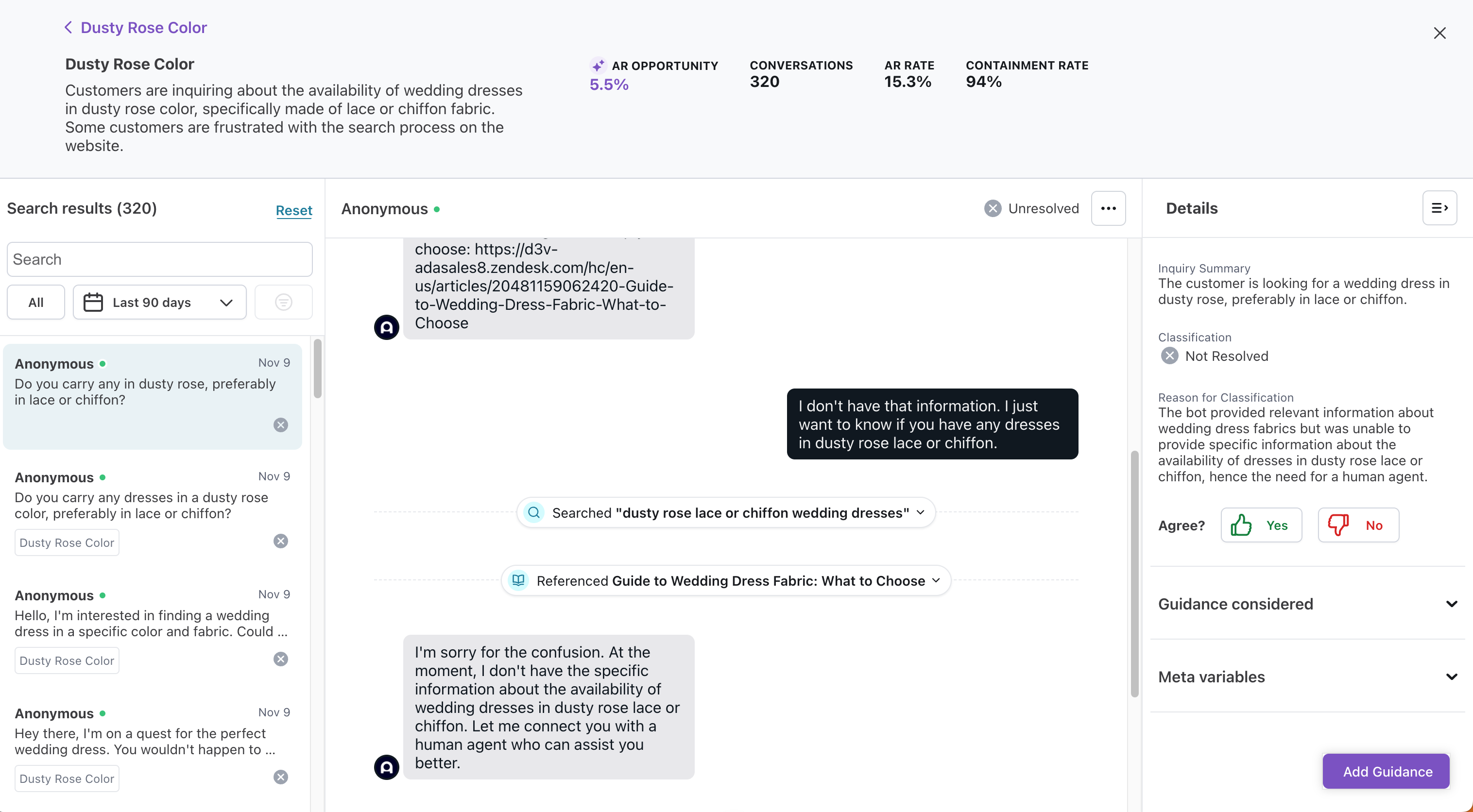 • Uncover opportunities for AI Agent improvements based on unresolved inquiries related to this topic