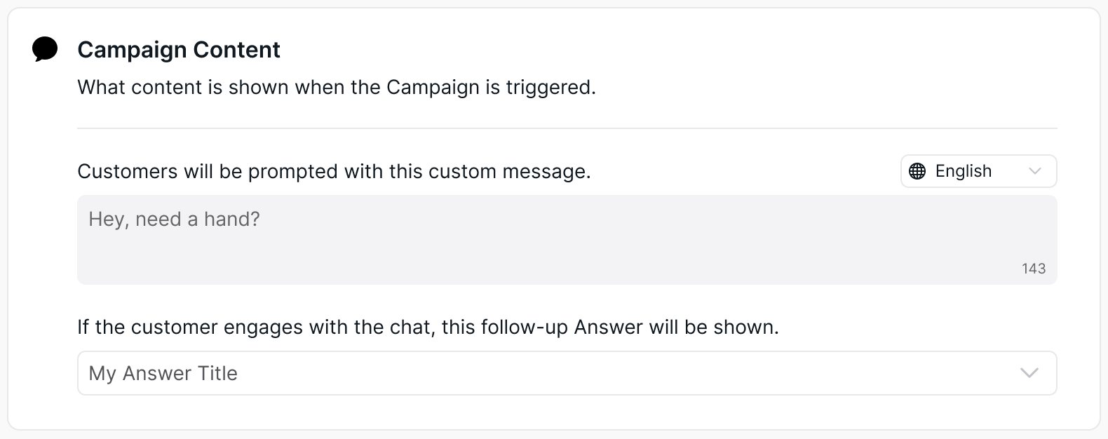 Campaign Content is the messaging for your Campaign. There are two parts to Campaign messaging. First, craft a proactive message your web visitors see pop out from the chat button on your webpage. Interested visitors can click the message or the chat button to engage your bot. The bot then opens the conversation with your chosen follow up message. This message is a bot Answer that you can tailor specifically for this campaign.