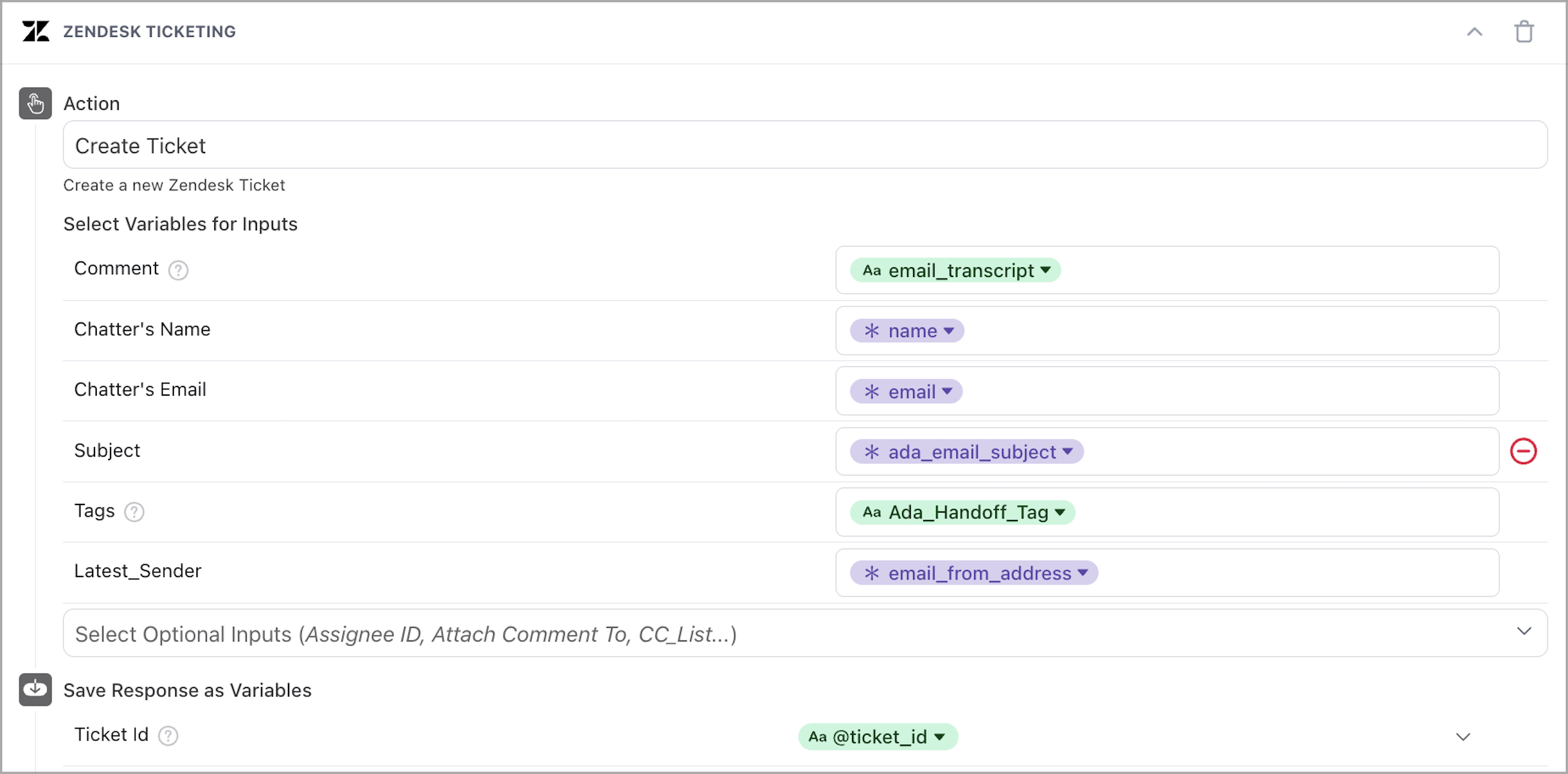 ticket_IDin the Email API metadata. For example:The variable name from the Email API metadata is saved in Ada with an Ada prefix to indicate its source. In the above example, the