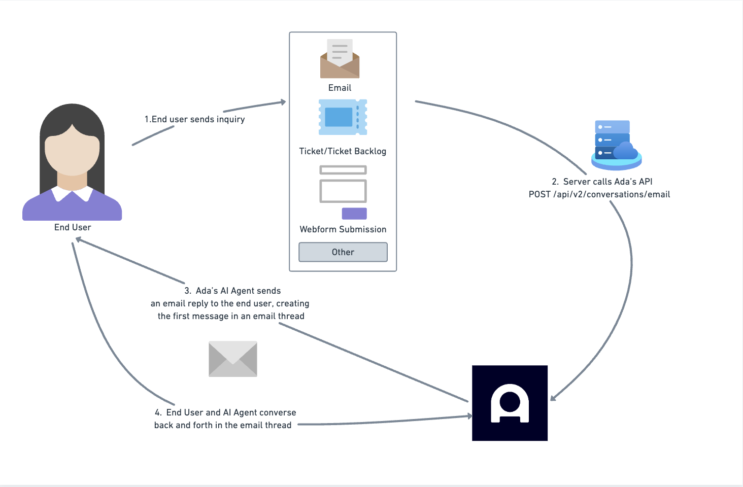 The Email API is an implementation of Ada’s Conversations API for the native Email channel. To use it, you’ll need either a form provider (such as Zendesk) or your own system that can make a POST API call when an email inquiry should be sent to Ada for automation. This call sends the form submission or email content to your AI Agent through the dedicated Email endpoint.