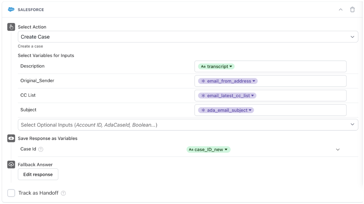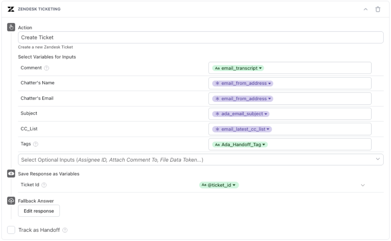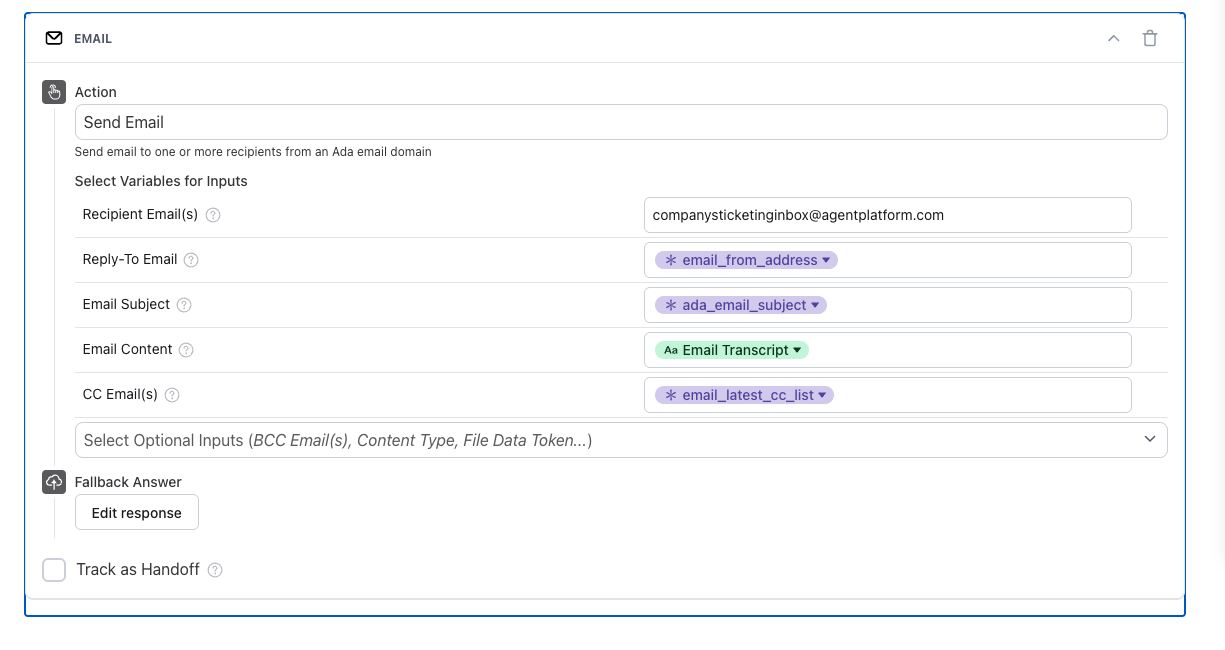 For other handoff blocks (like Zendesk Ticketing, Salesforce, or Email App). Ada does not automatically populate the CC field in your agent platform. To replicate this functionality: