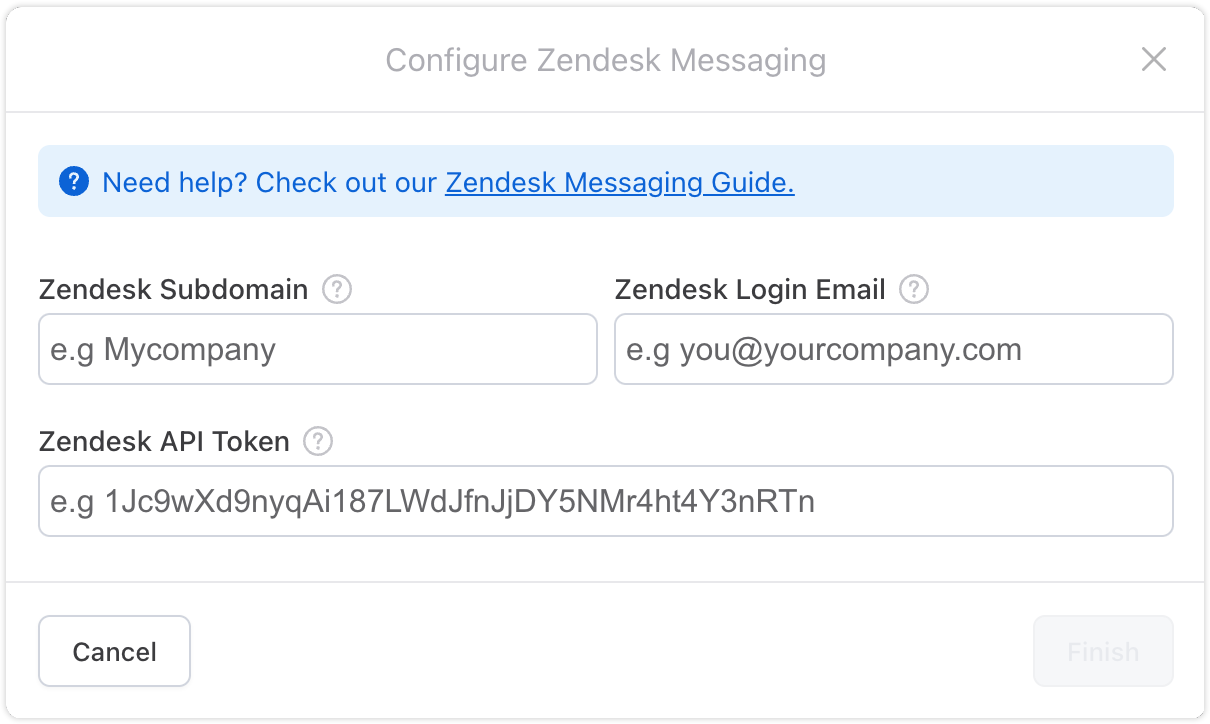 Refer to the Zendesk user guide Generating a new API token for guidance on creating an API token for your Zendesk Messaging integration.