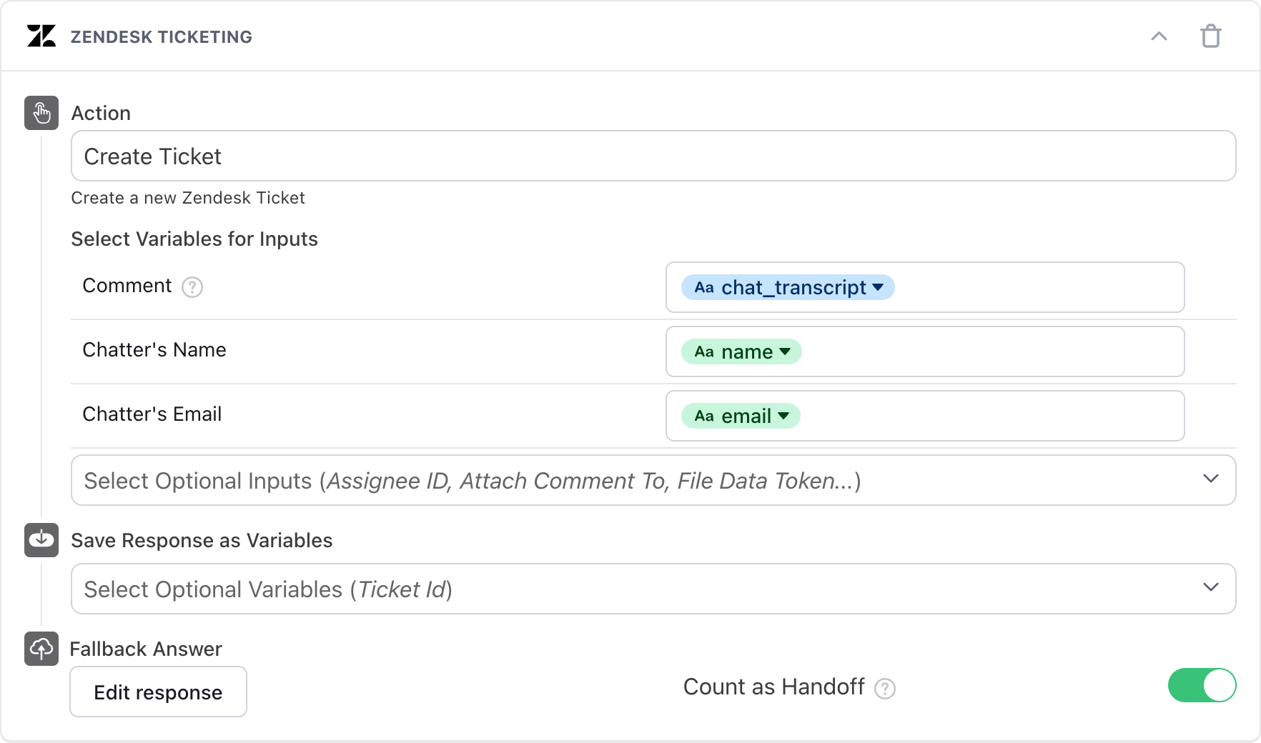 Let’s look at the three blocks necessary to build out a Zendesk ticketing handoff.
