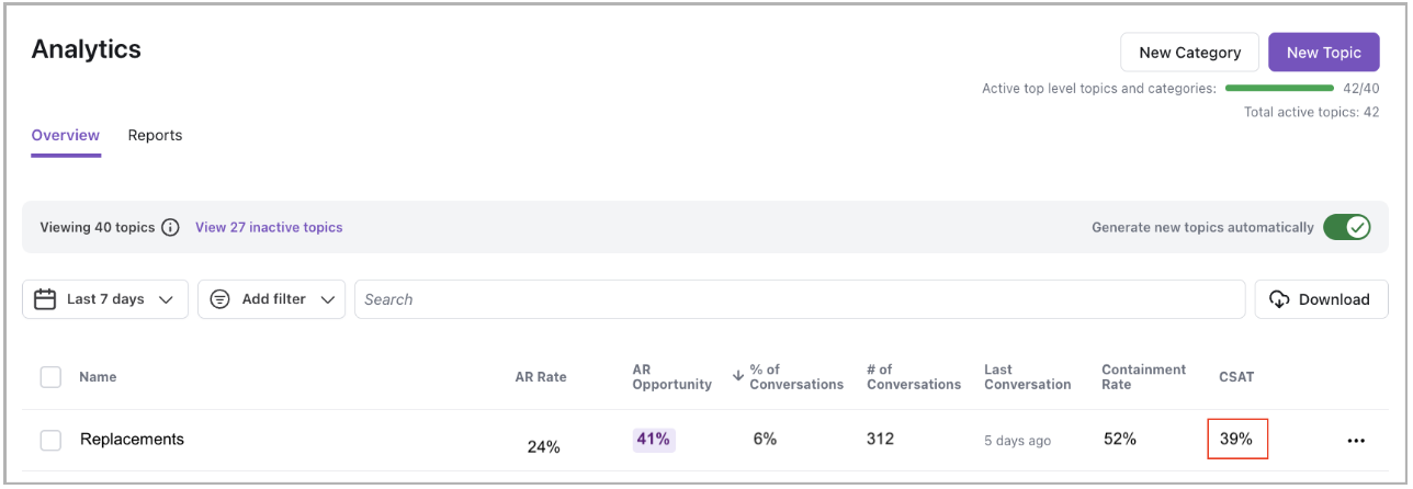 - Use overall CSAT scores as another reference point — if CSAT is dropping, check the CSAT rate on the Topics tab.