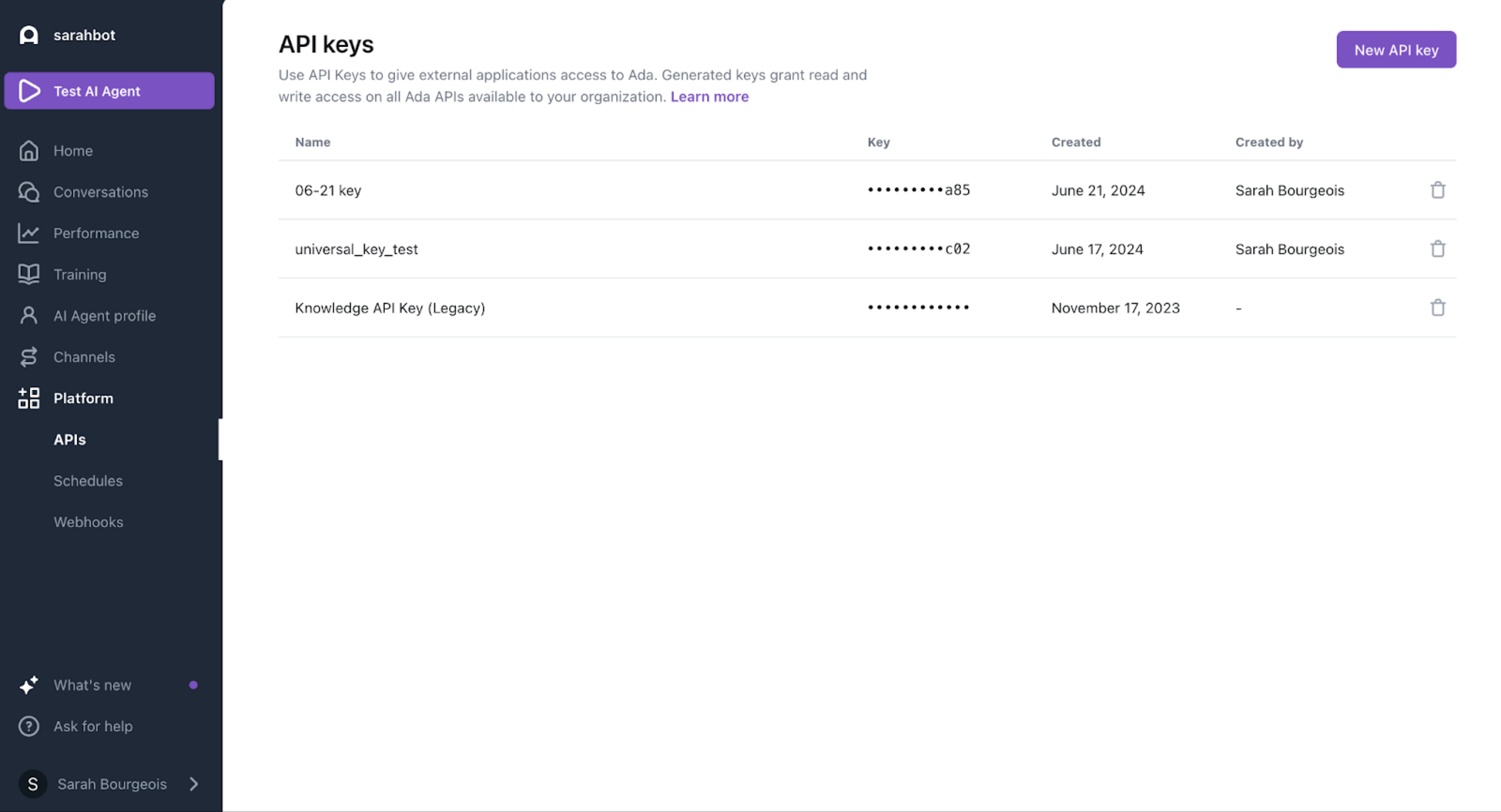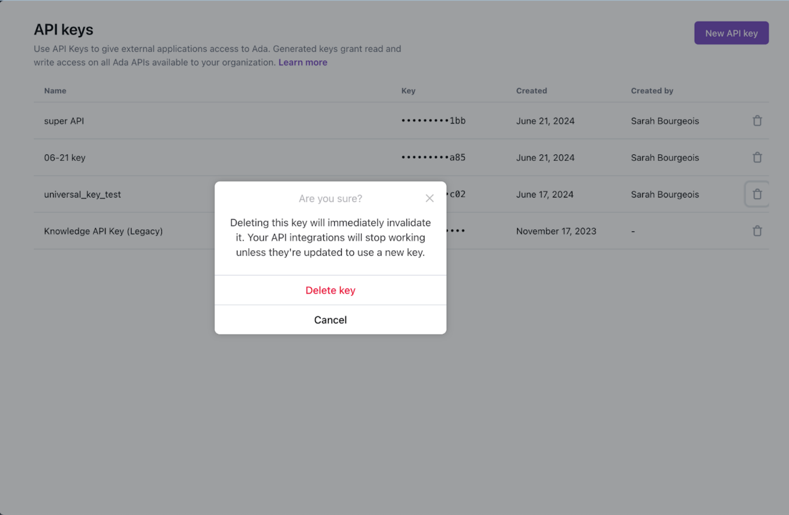 For security reasons, the Ada dashboard only displays your API key once. If you lose this key, you’ll need to create a new one. -