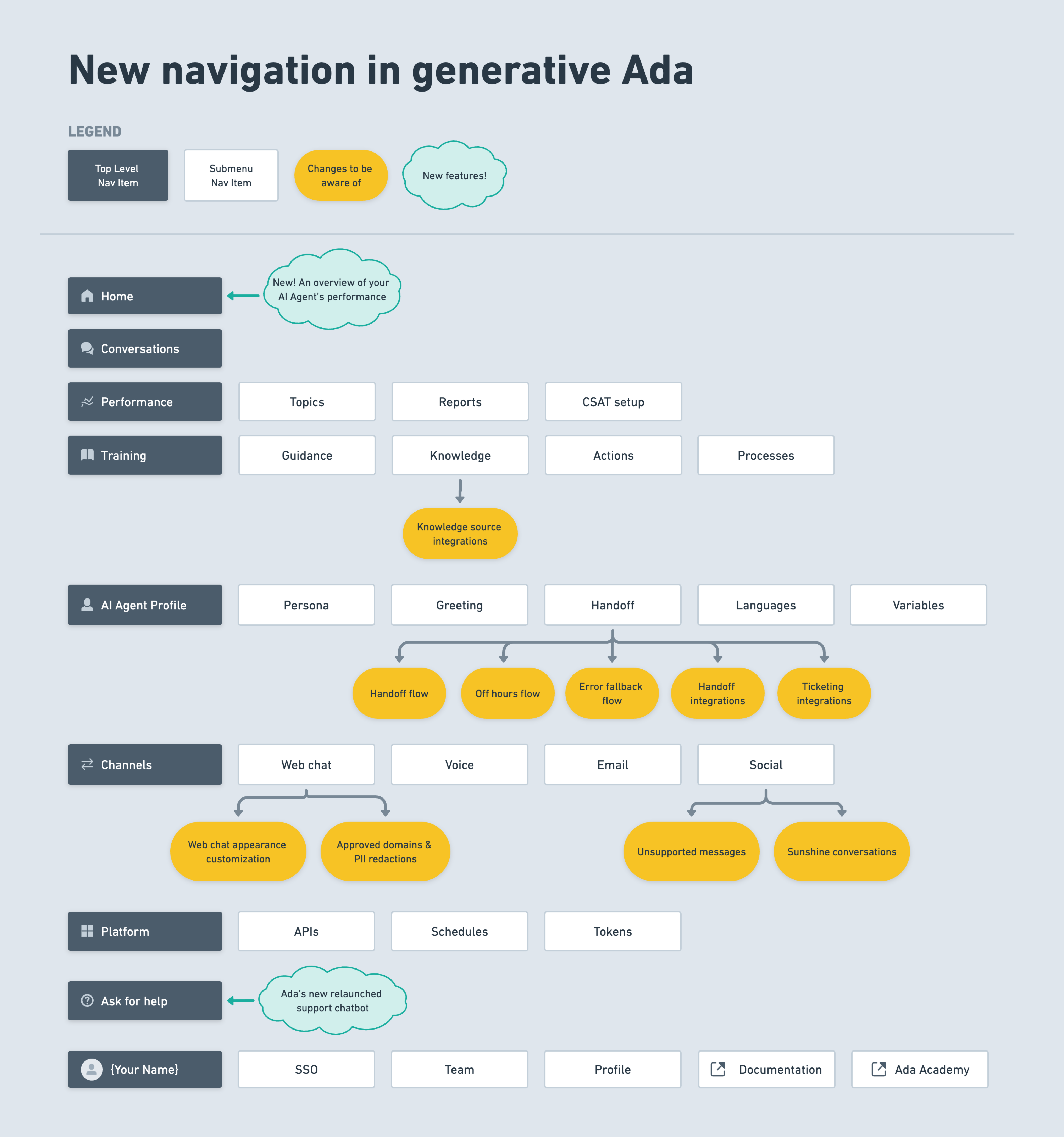 We’re thrilled to unveil a redesigned navigation for the generative Ada dashboard, aimed at improving the user experience and providing intuitive access to new and improved features. Below, we’ve detailed the updates grouped into key areas for your convenience.