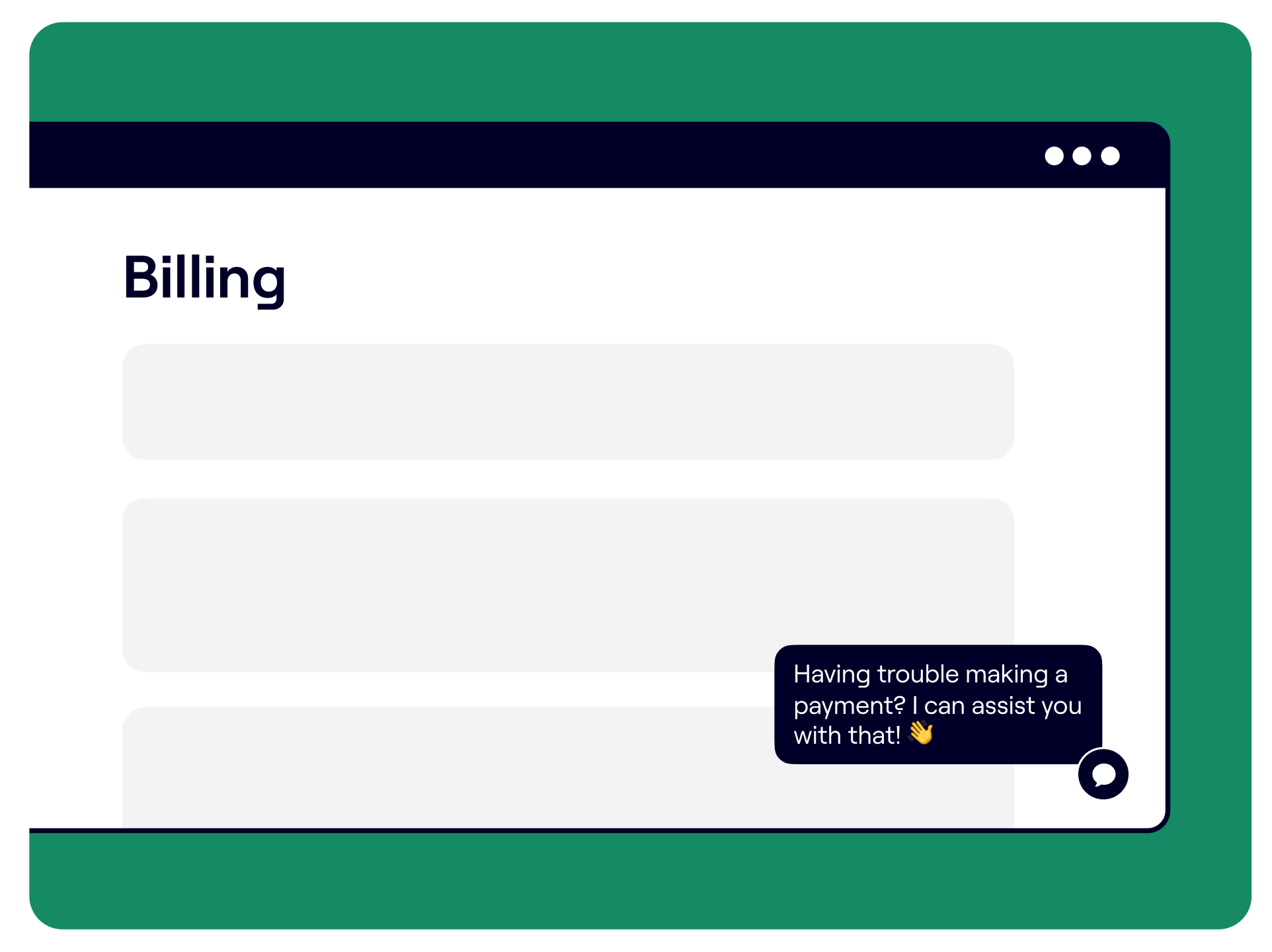 For example, if a customer is on a billing page and payment is a common issue, you can proactively reach out and ask “Need help with paying your bill?” The customer can then click on the chat and go directly to the payment flow.