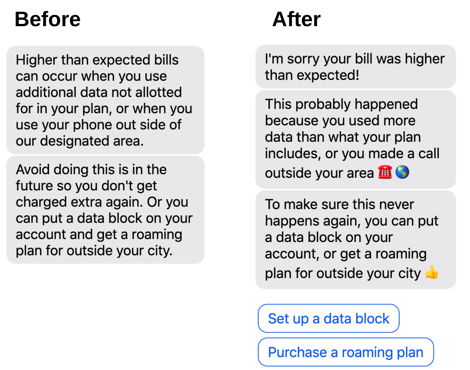 Customers contacting support have a need that is not being fulfilled. When they come to the chatbot, there is a good chance that they are already frustrated. Conveying genuine empathy in your Answers makes your customers feel understood and respected.