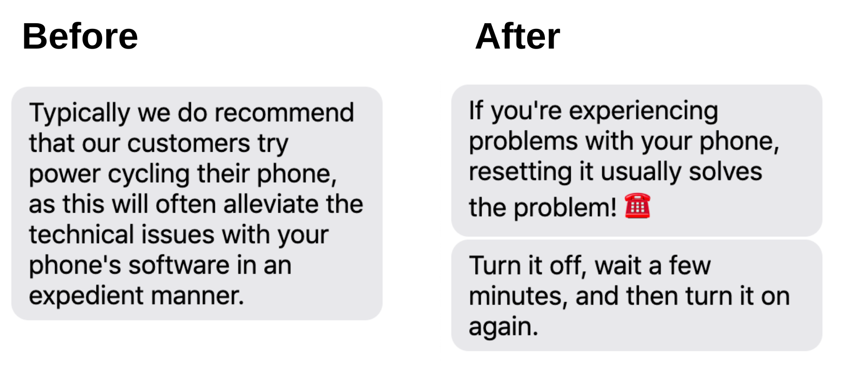 Sentences written in the active voice are shorter, tighter, and easier to read. They also address your customers directly, and make the chat feel natural.