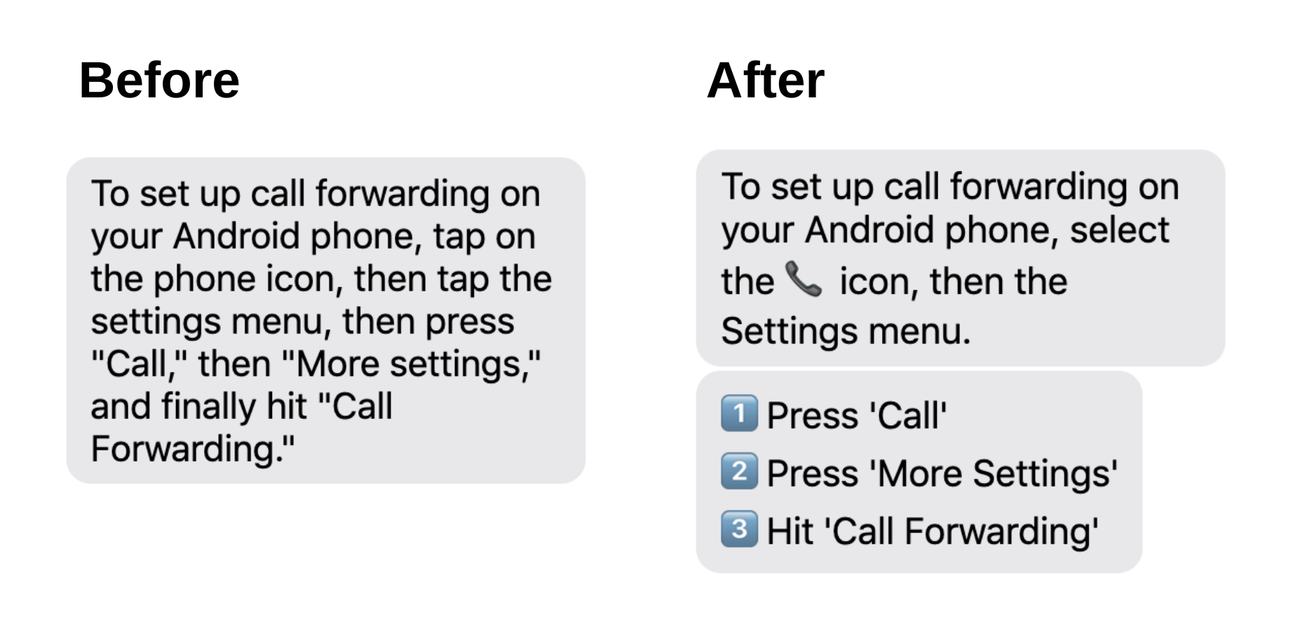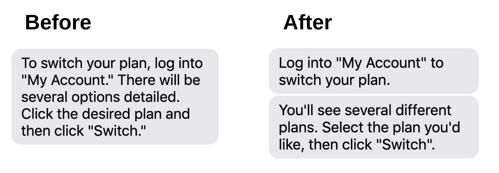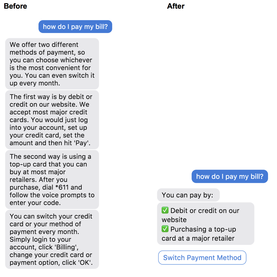 Chatbots help customers find the answers they need, quickly. Most customers are on-the-go, or multitasking, and don’t want to read through unnecessary context to get their answer, so when you write your bot content, take care to keep it as simple as possible.