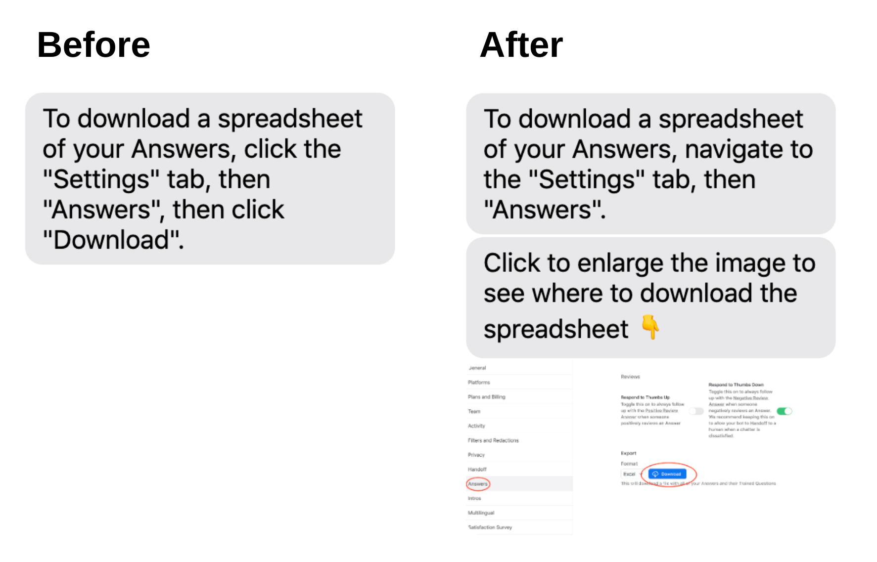 Writing great content is key to create an engaging chatbot your customers will love. This guide is designed to help your team craft Answers that deliver a first-rate customer experience and have a measurable impact on your KPIs. If you invest time in applying these best practices, we’re confident you’ll see a serious boost in your CSAT score and deflection rates.
