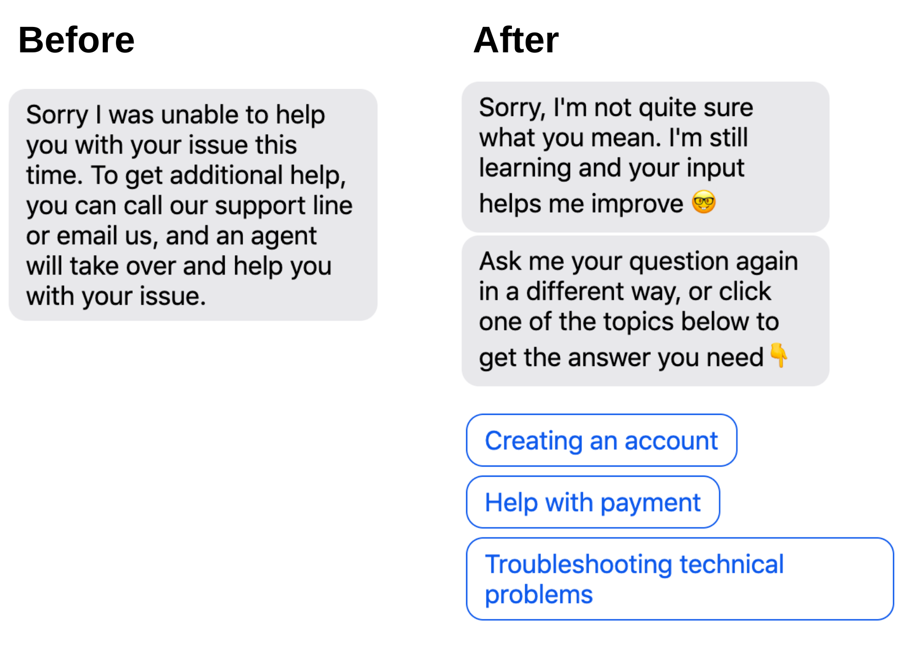 It’s important to acknowledge when the bot doesn’t recognize a customer’s question. It creates a more empathetic experience for customers, and indicates whether or not the bot can answer their question.