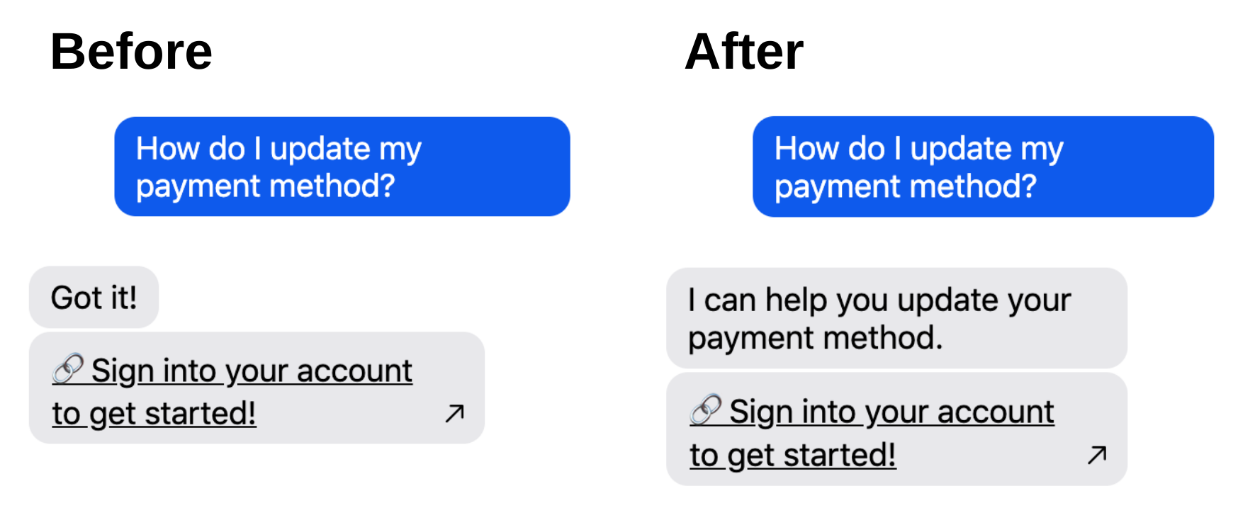 Instead of “OK, I can help with that!” be more specific: “I can help you manage your billing preferences!” This way, if the Answer happens to be slightly off topic from what the customer was looking for, they will know right away and can rephrase their question.