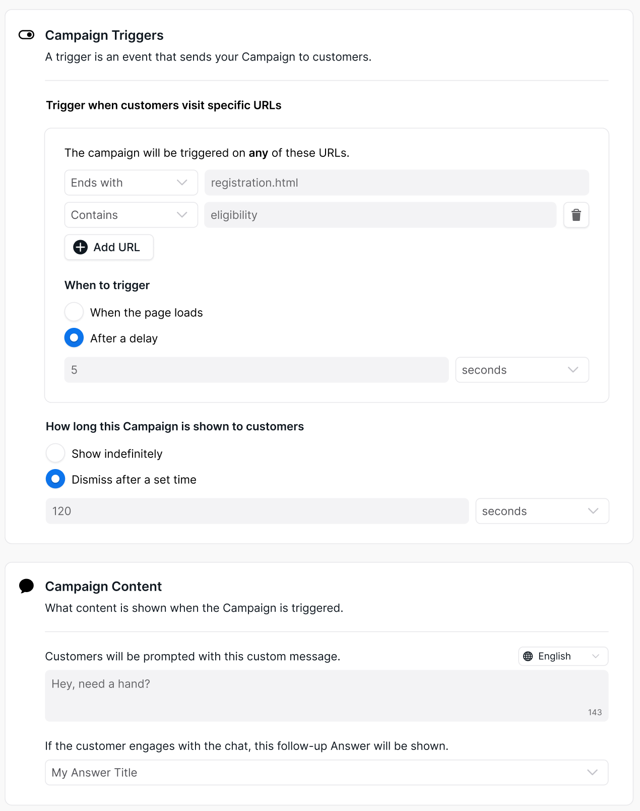 Campaign Triggers define the parameters in which the Basic Proactive Campaign will be surfaced. The Campaign will be triggered on any of the URLs you provide. To add URLs to your Campaign Triggers: