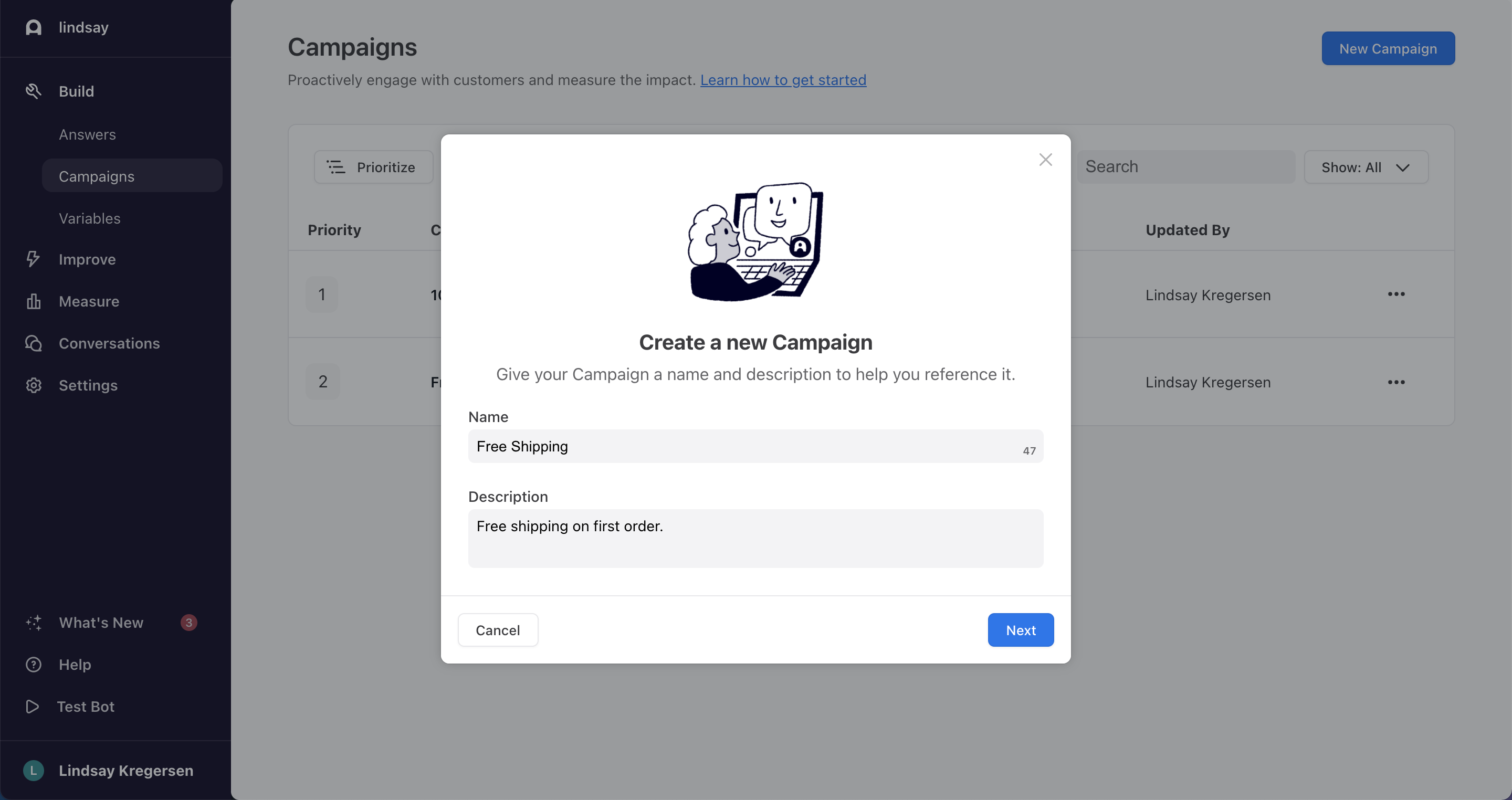 Campaign Content is the messaging for your Campaign. There are two parts to Campaign messaging. First, craft a proactive message your web visitors see pop out from the chat button on your webpage. Interested visitors can click the message or the chat button to engage your bot. The bot then opens the conversation with your chosen follow up message. This message is a bot Answer that you can tailor specifically for this campaign.