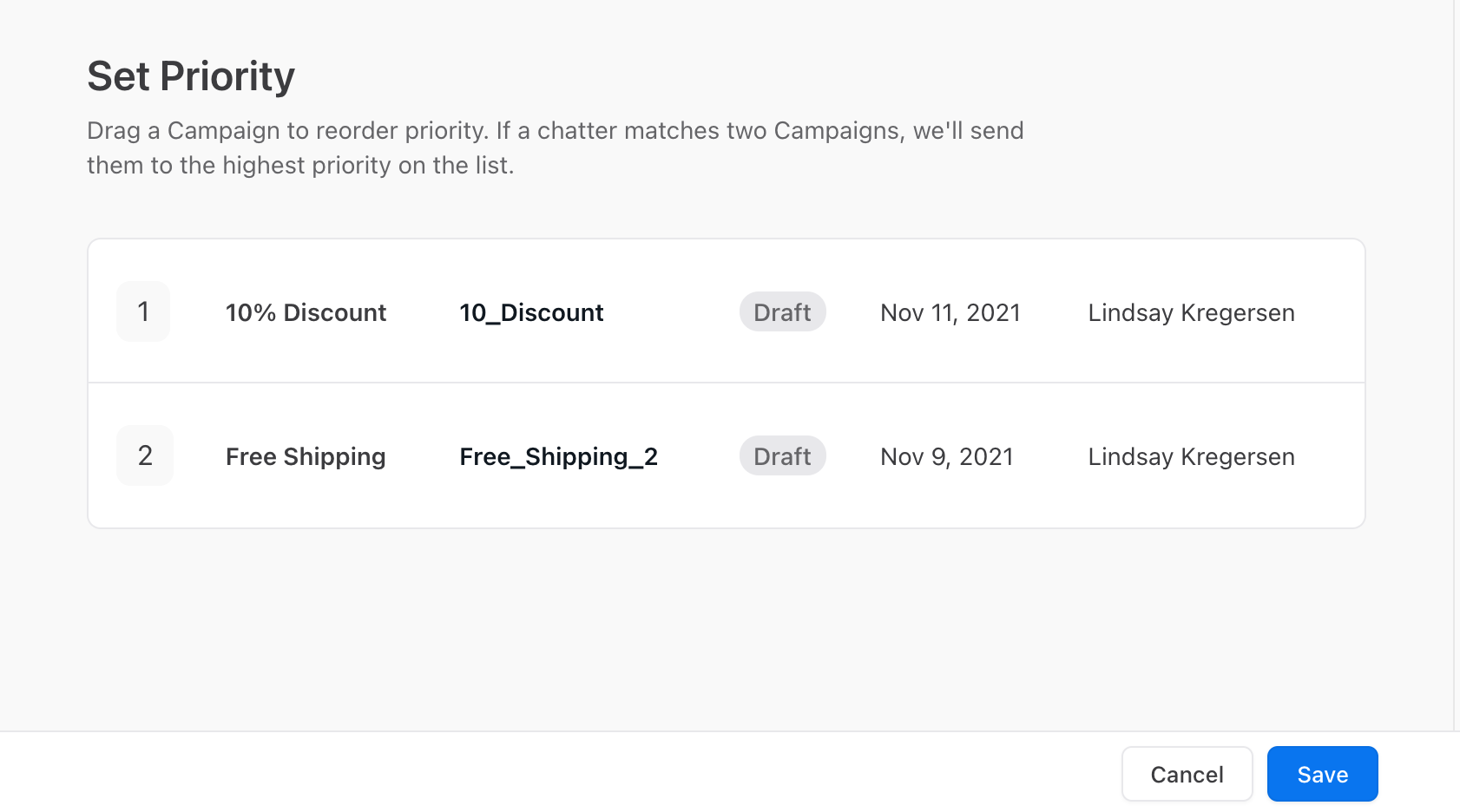 In the Set Priority dialog, drag and drop your Campaigns to reorder their priority.
