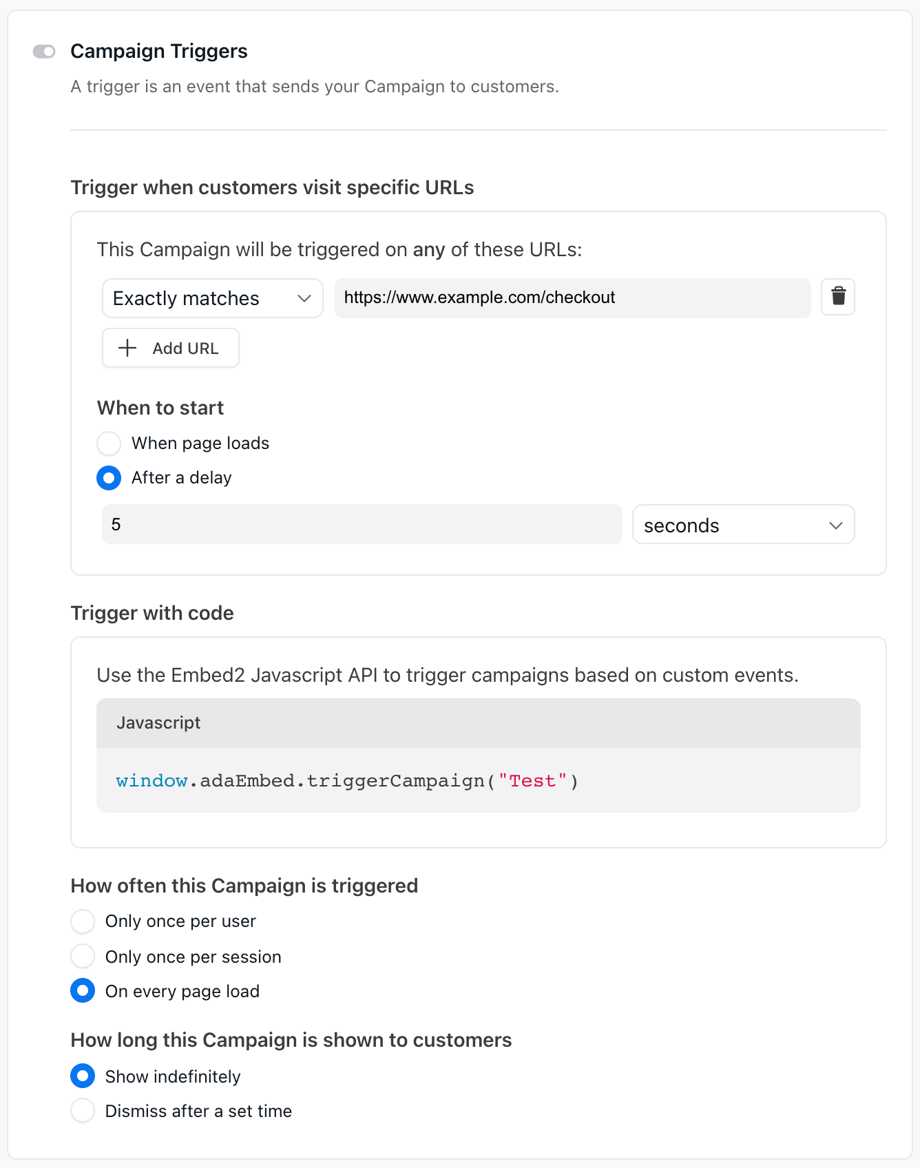 You must include the Ada Embed Code on every webpage where you want to trigger this Campaign. Learn more about Ada Embed2.