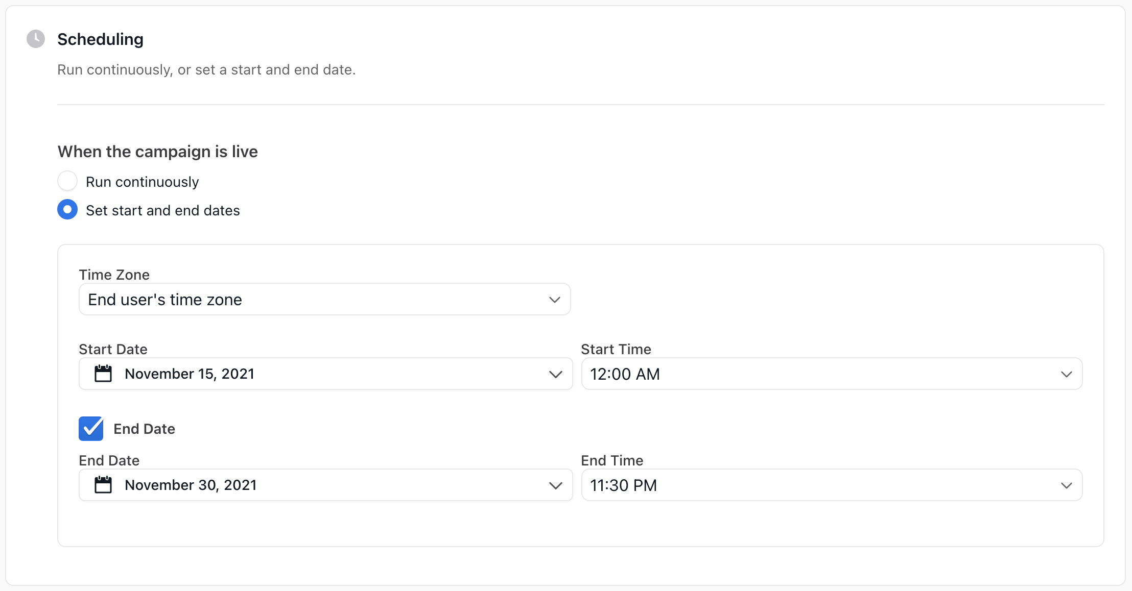 If you select Run continuously the published campaign will run until you choose to unpublish it.