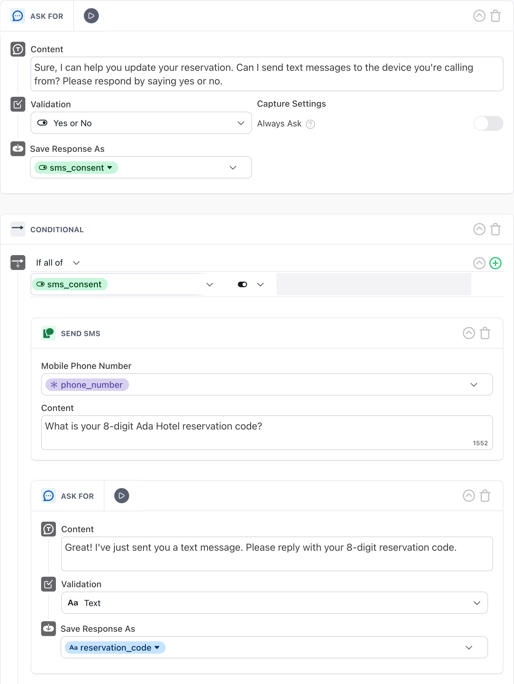 Before sending any SMS messages to a caller, you have to collect their consent. Generally, you only have to do this once per conversation - once you have consent for one Answer flow, you don’t have to ask for consent to send another SMS for another Answer flow.