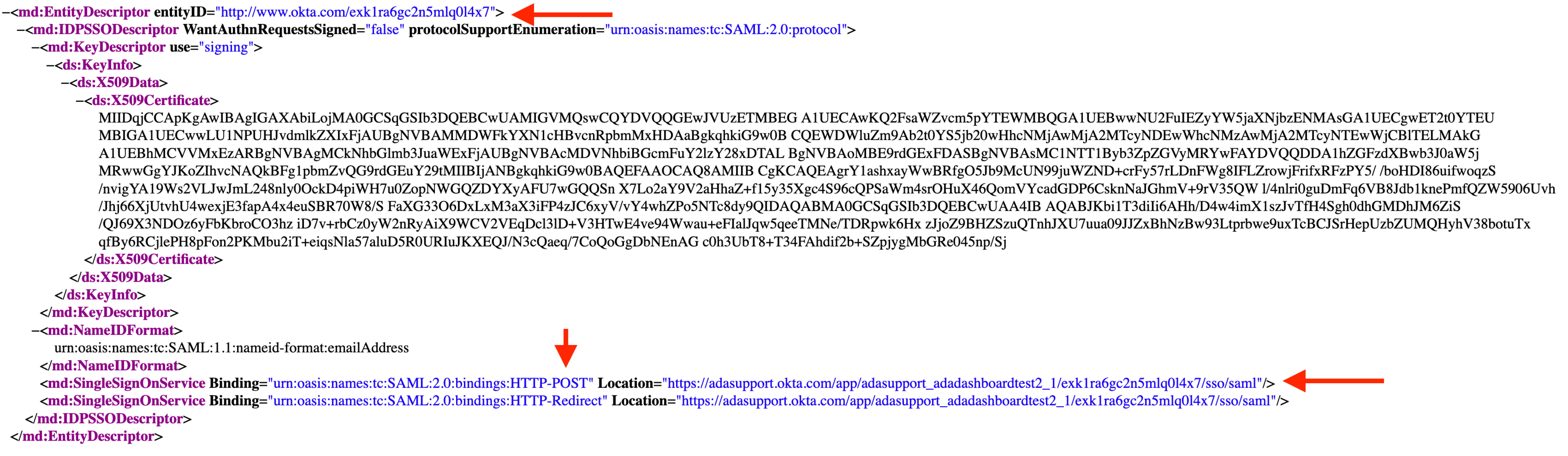 Some IDPs have different names for these values. The most reliable way to find them is to find an IDP Metadata