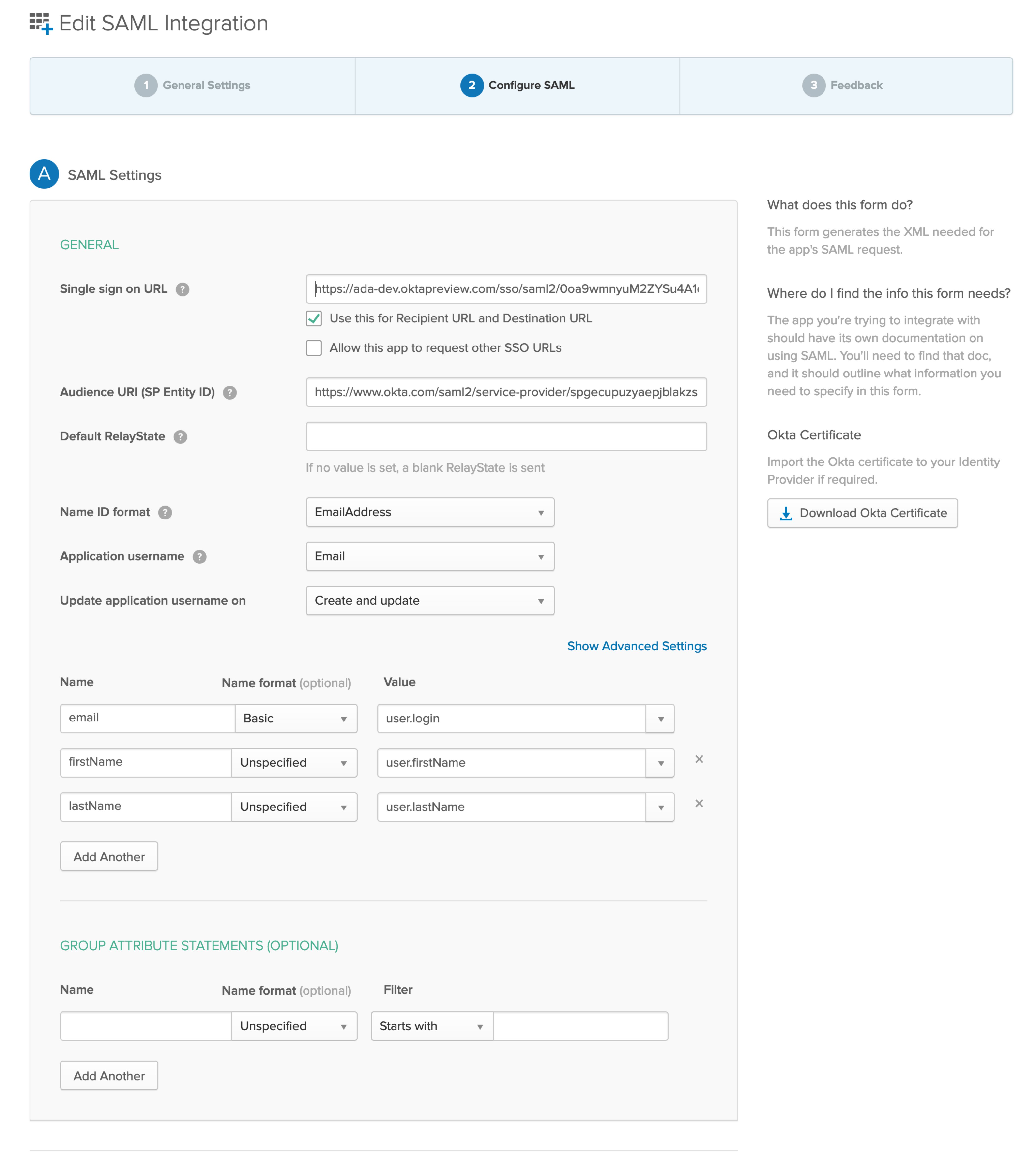 This example shows a completed SAML application configuration in Okta. Note that there’s also a button to download a certificate, which you’ll need in step 4. Different tools make the certificate available in different places.