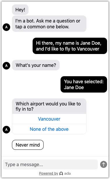 In the below example, the chatter opens the conversation by introducing herself, and asks to book a flight to Vancouver. By providing a list with the captured text, along with one or more prediction options that can be clicked, the bot saves the chatter’s details and requests.