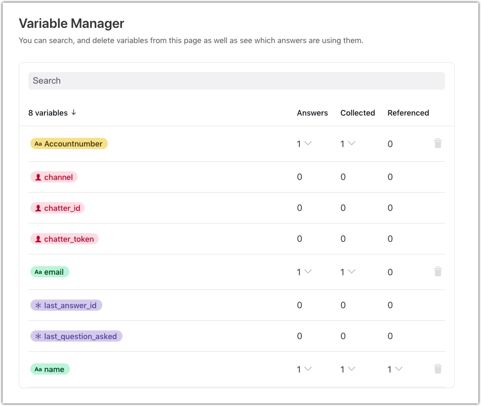 With the Variable Manager, you can keep track of where and how your variables are being used. You can search for and delete variables from the Variable Manager page and view which Answers are using specific variables.