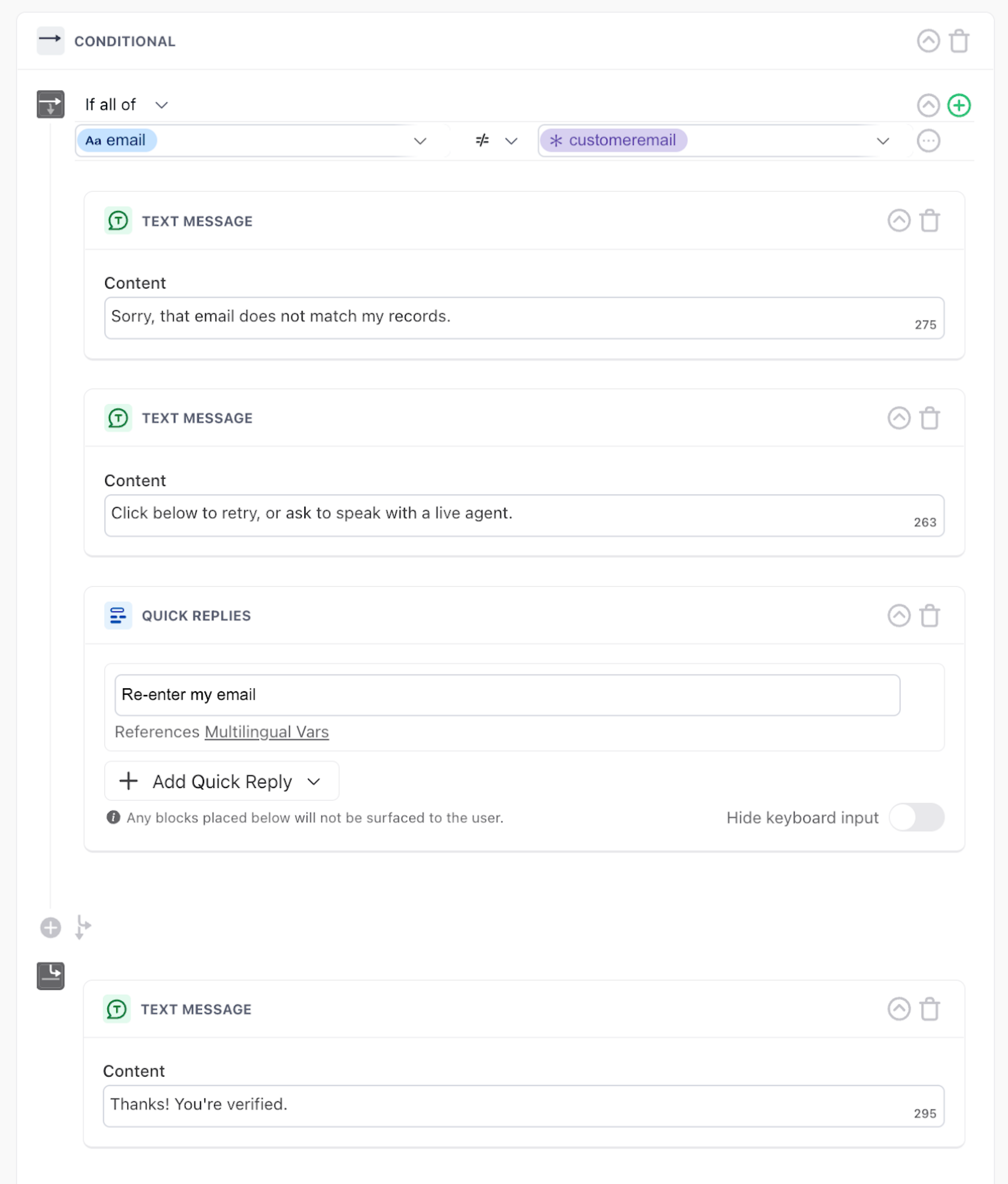 Using a Conditional block, verify whether the information the chatter provided matches the information your bot has. Then, create responses for both successful and unsuccessful matches.