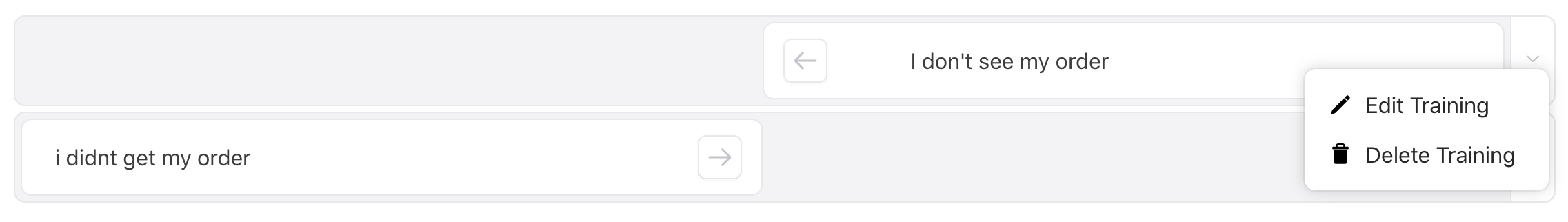 Delete Training Click the down arrow on the far right of an answer’s cell to view a menu of possible actions. Clicking Delete Training will prompt you to verify that you want to delete the training question from the answer. Click Delete to confirm.