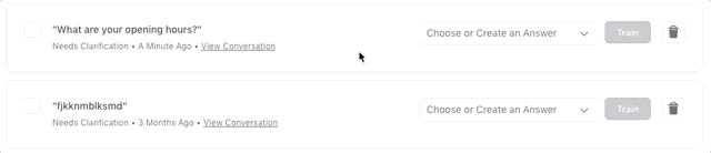 If there is an existing Answer within the bot that would be appropriate to provide for this question in the future, use the corresponding dropdown menu to select the answer, and then click Train.