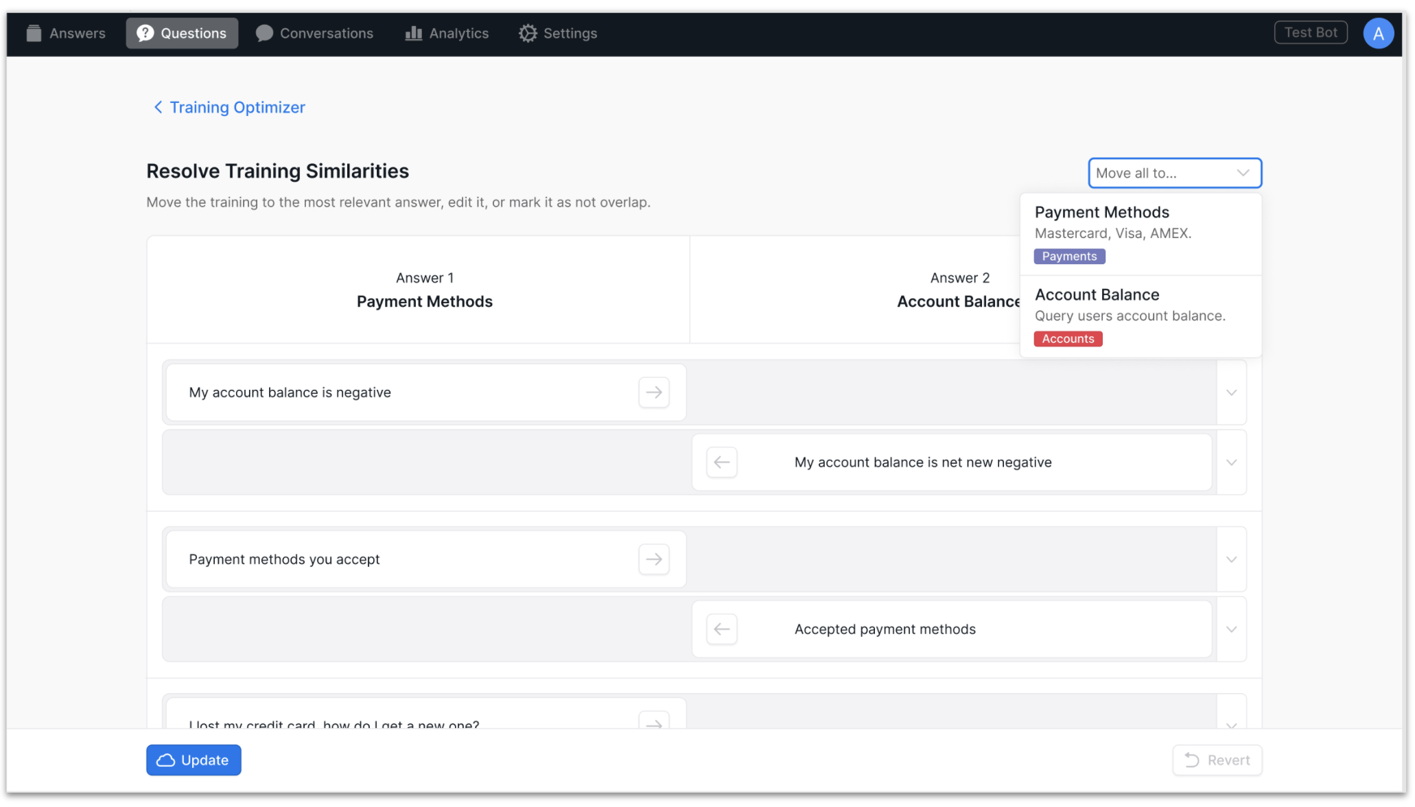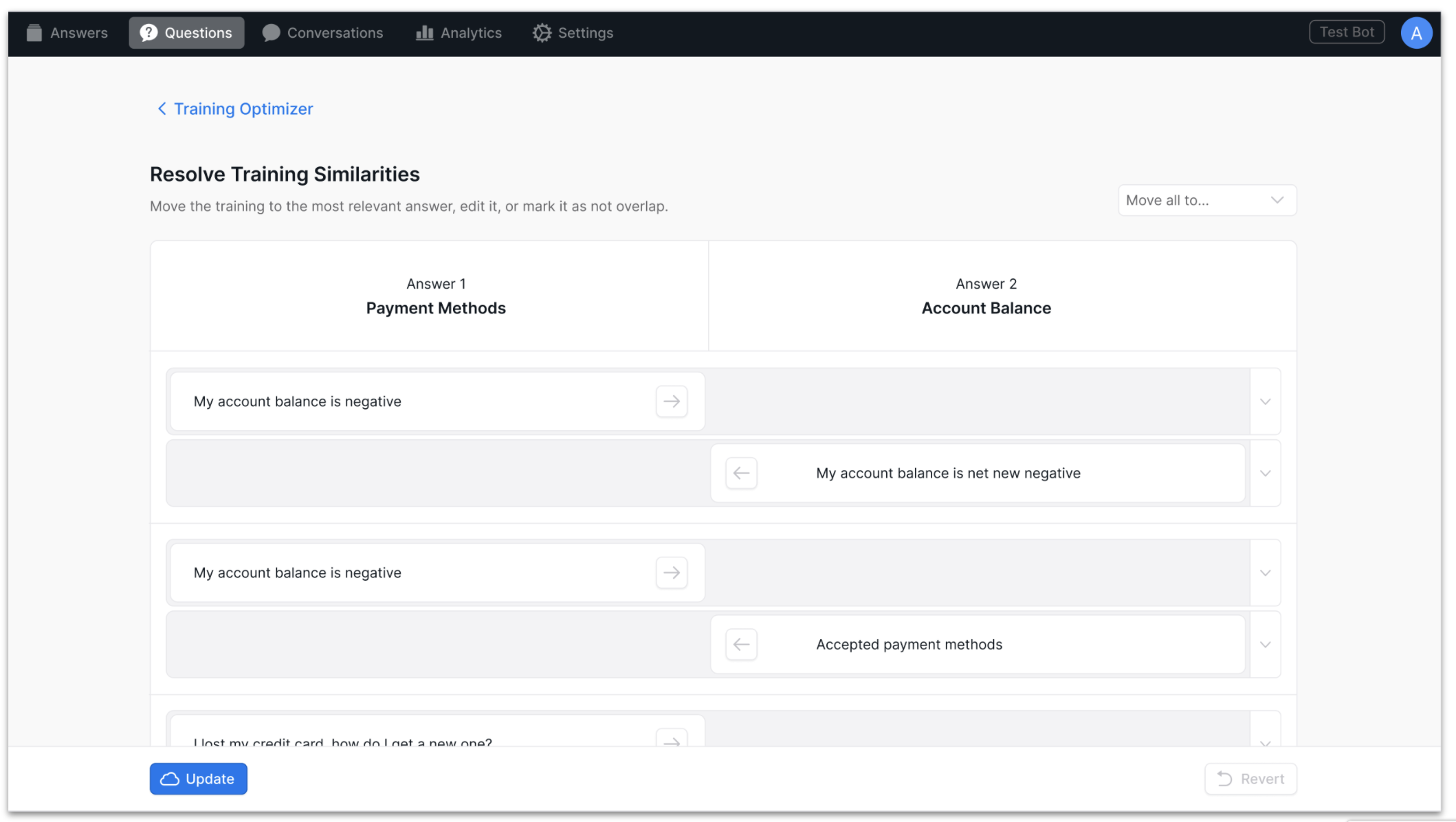 Move all to… To move all of the similar training questions to one Answer, click the Move all to… dropdown in the upper right corner, and select the Answer you want all of the training questions to be moved to. Click Update to set the revised training.
