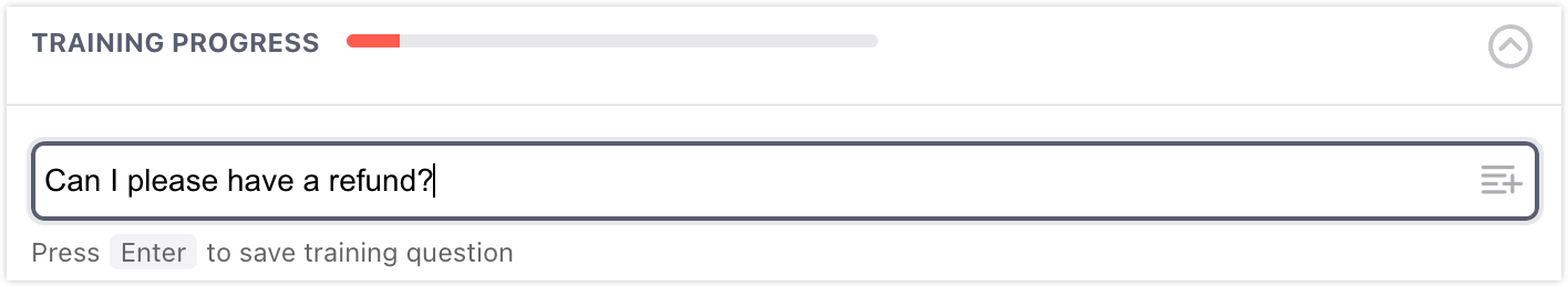 In the Answer Training section, at the top of the Answer editor, type a sample question or phrase into the input field, then press Enter on your keyboard to add the question to the training for that Answer.