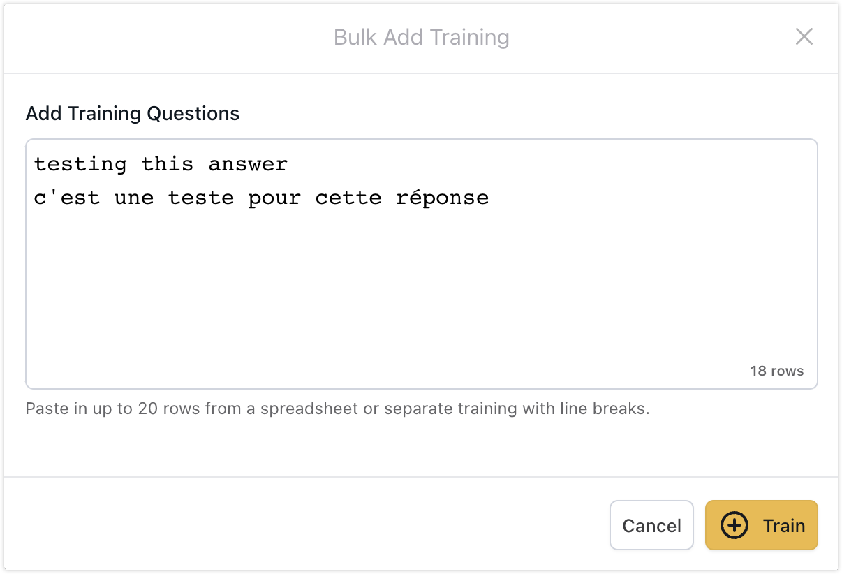You can train Answers in more than one language if your bot has the multilingual feature. With that feature, your bot can recognize training in any language you’ve enabled under the multilingual settings.