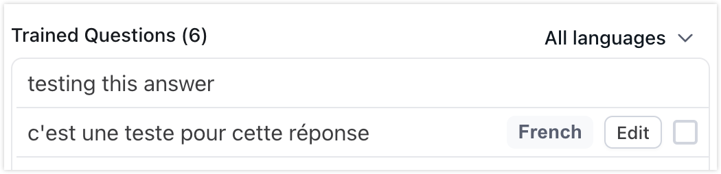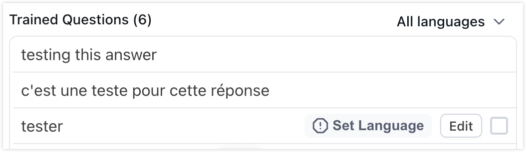 When you add a training phrase to an Answer in a multilingual bot, the bot can detect if the phrase is written in a language you’ve enabled. Each training phrase displays a label indicating the detected language. Hover over a phrase to reveal the label. A Set language label indicates that your bot either couldn’t detect the language confidently, or the language is not enabled in the multilingual settings.