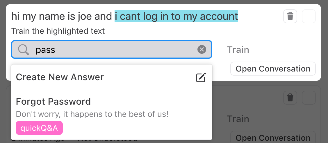 You can also choose portions of a chatter’s conversation to Train to an Answer. The Conversations view lists all customer conversations, and can be expanded to view full transcripts.