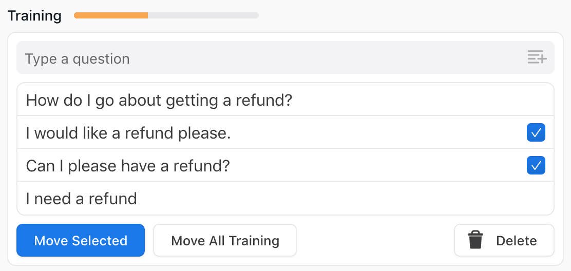 To move all of the questions from this Answer to a different Answer, select one training question, then click Move All Training.