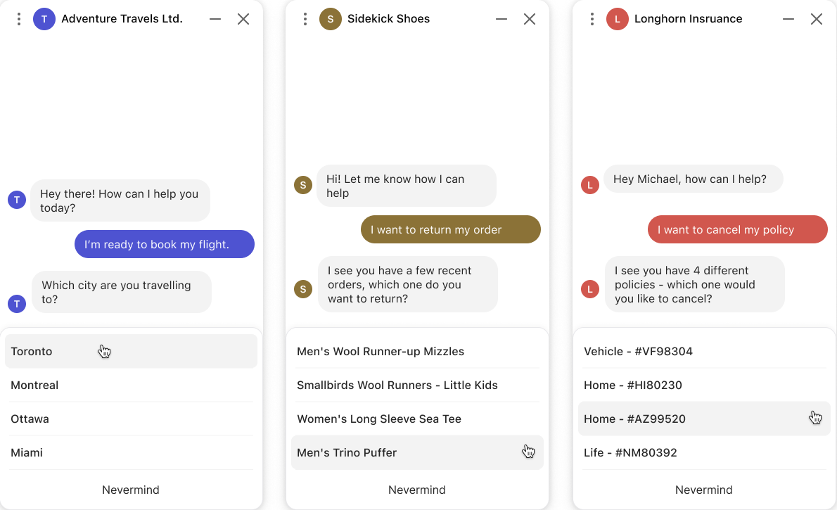 If they don’t, and they click Never mind instead, your bot will exit the Answer flow and redirect the chatter to the Cancel Capture Answer.