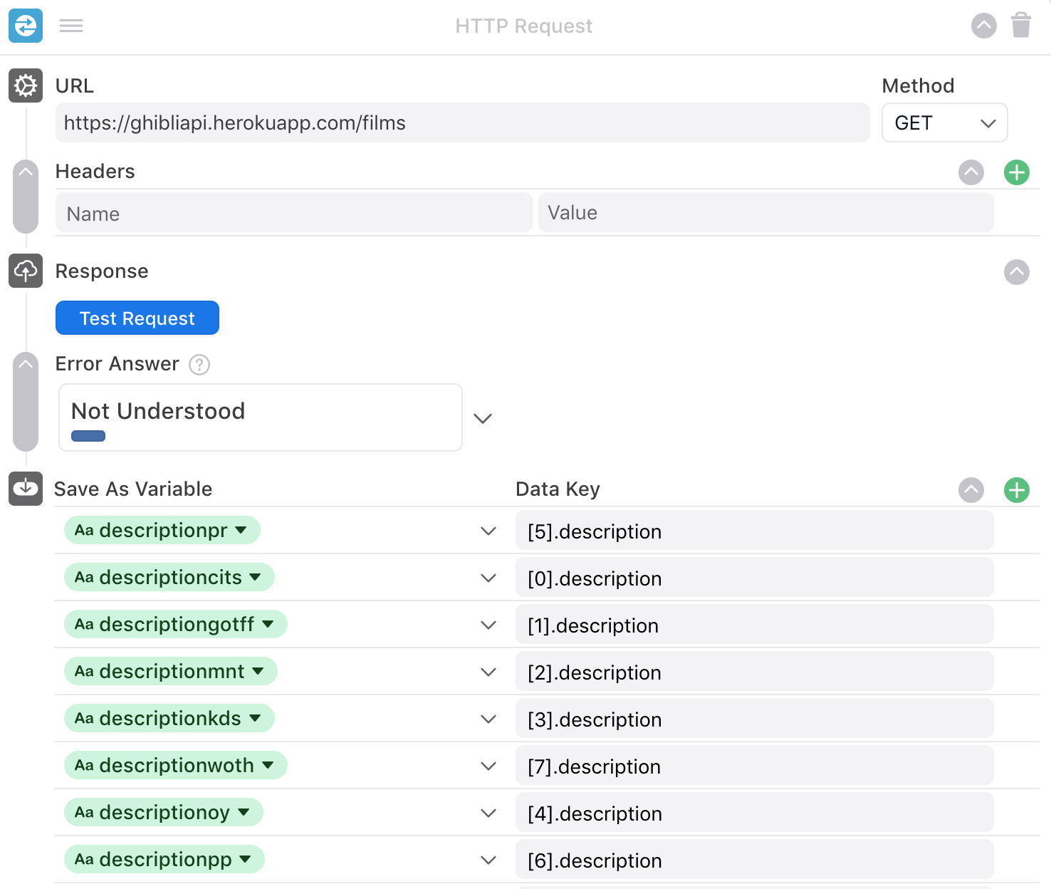 The Request block lets your bot make calls to an API. The information you receive from the API can be saved as variables and used in your Answers. For more information, see What is a variable?.